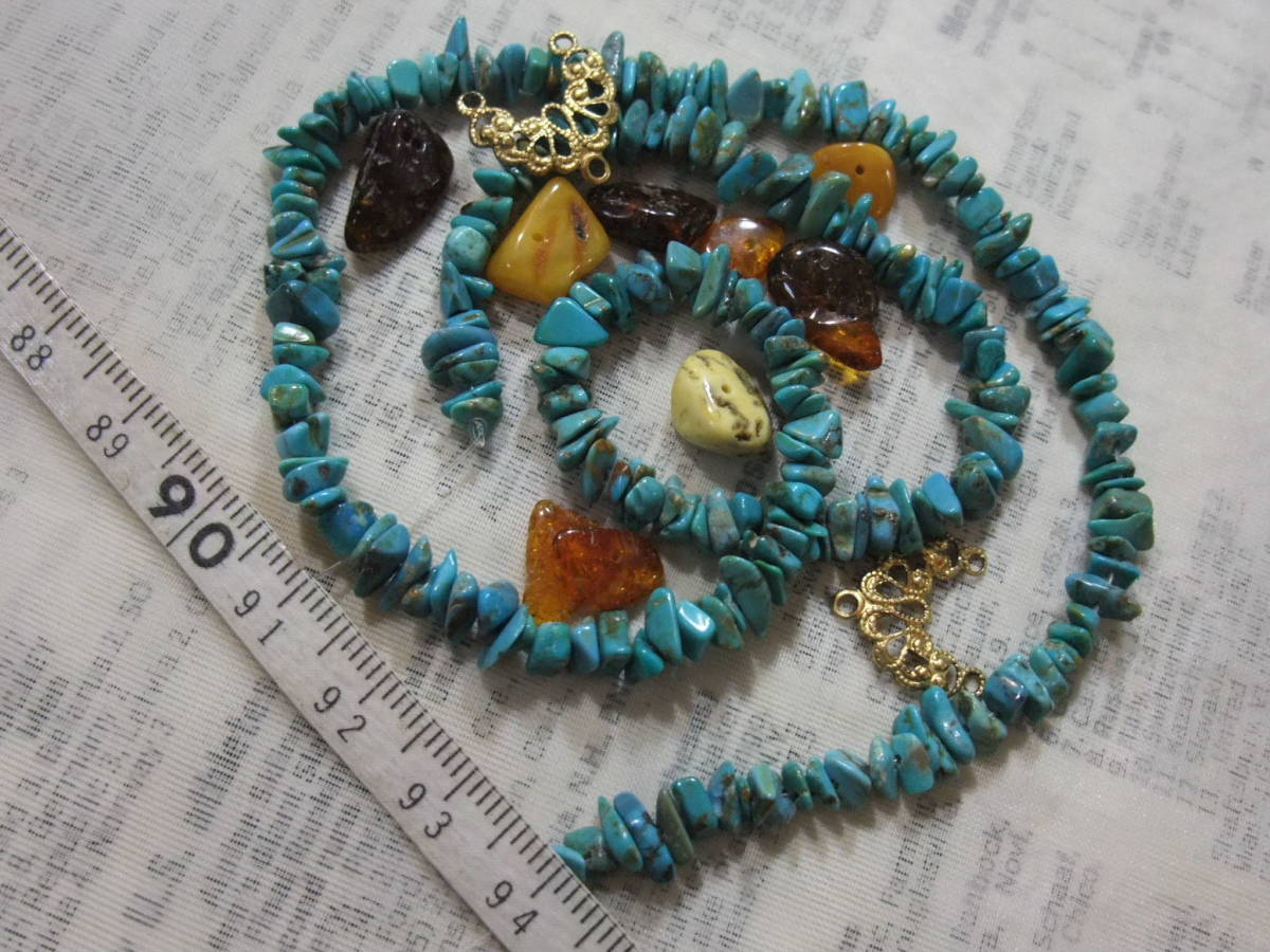 さざれとはいえ、高品質なアメリカ産のお色のきれいな本ターコイズ、やや以前の仕入れにはなりますがアメリカ産の正真正銘の本トルコ石の約40cm1本と(さざれですので詰め具合によって誤差は出ます。その旨ご了承ください☆)、古いものですがリトアニア産バルチックアンバー本琥珀のフリーシェイプ系さざれの小粒平タンブルのルースをつけてさらにアンティークなレトロデザインの真鍮メタルパーツをプラスして、お得感しっかりのセットにしてみました♪本ターコイズ連材はやや時間が経過したお品になりますが美しく、ハウライトやアグネサイトの染めたものではなく、本物のターコイズです☆ブルーの部分とインクルージョンが特徴的で良い風合いと思います(アメリカ産は間違いないですが、地域・鉱山までははっきりしないです)。石の特性上エンハンストリートメントはしていますが、高技術の仕上がりで、ブラスゴールドな真鍮パーツにとてもよく似合います。 穴開けはどれも0.34mmワイヤーが通ります。