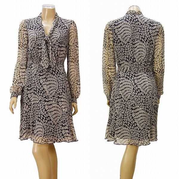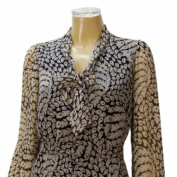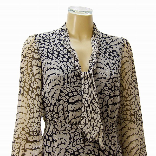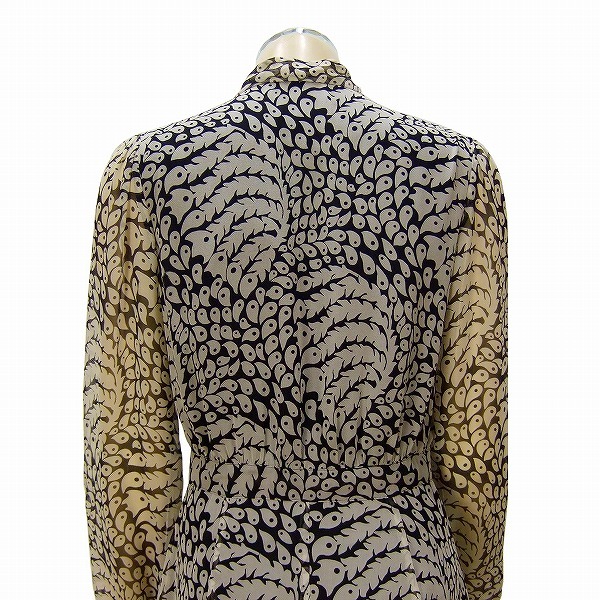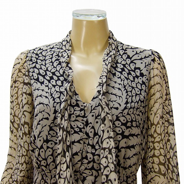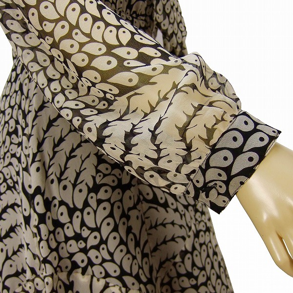 **・゜極上シルクシフォンの高級ドレスワンピースです。アンソロポロジーとのコラボレーションデザインです。極々淡アイボリーベージュ系&黒系の北欧孔雀フェザー風柄(勾玉を繋いだような羽柄)のシルク(絹)100%シフォン生地を使用!!透け感のある優雅な一重パフスリーブ(袖口1つボタン留)×ショール風胸元リボン(取り外し不可)×前身頃10個くるみボタン留×胸下切り替えギャザー入り×接ぎパネル&ジュップ風接ぎの贅沢な変形フレアーデザインです。凛とする勾玉柄繋ぎの高級シルクドレスワンピースです。.。*:.。
