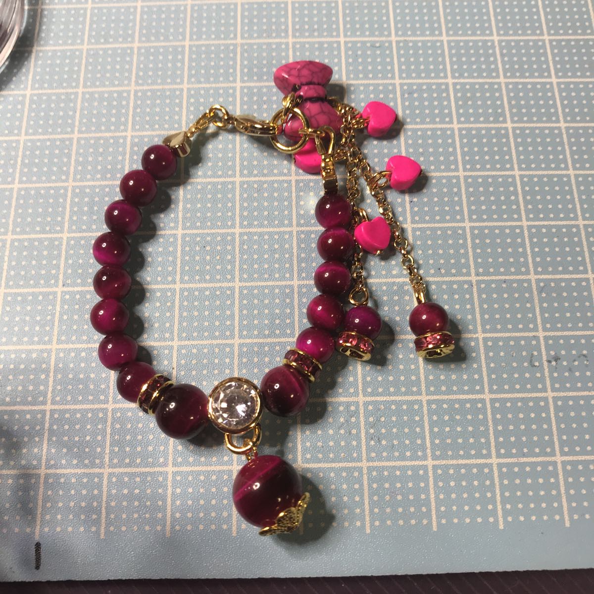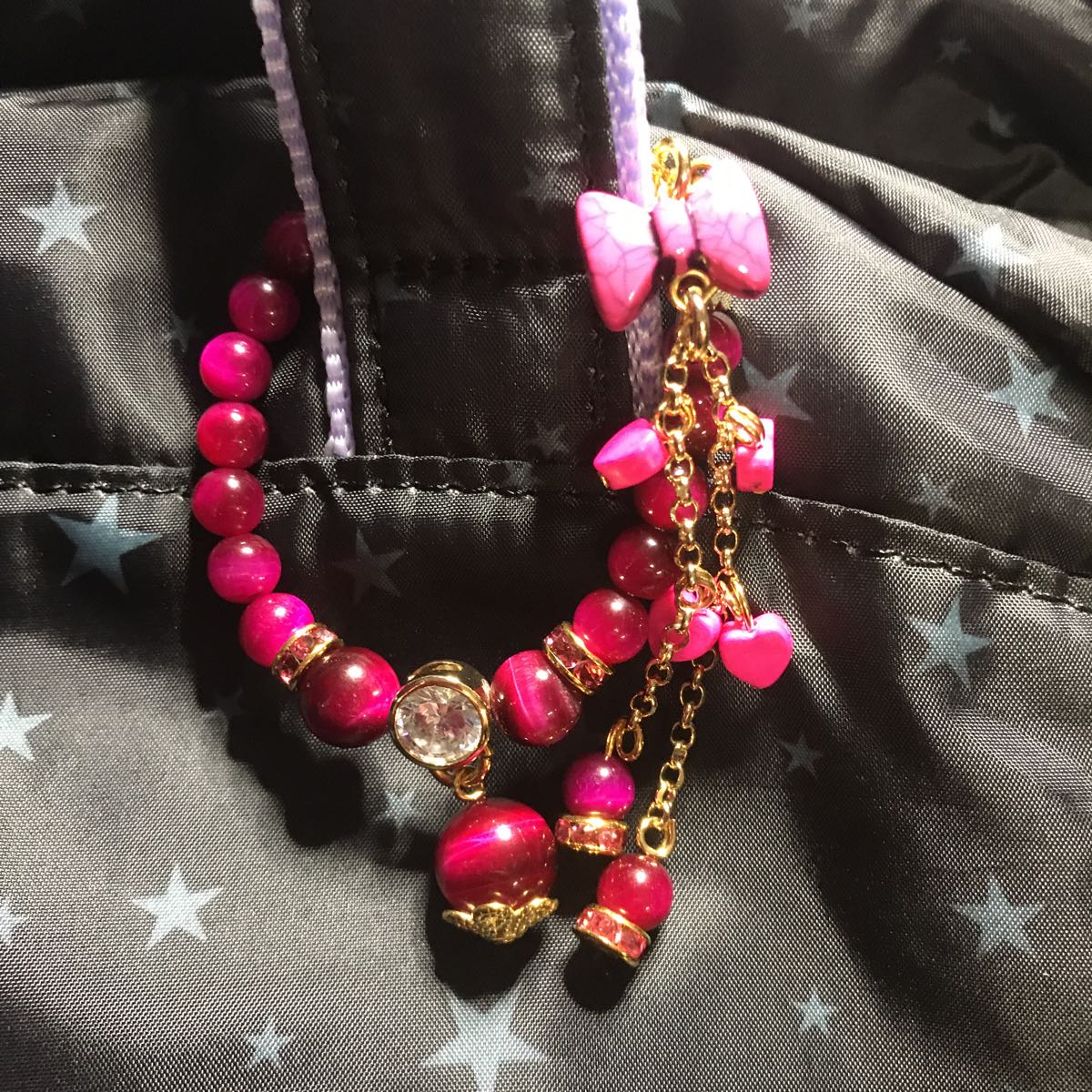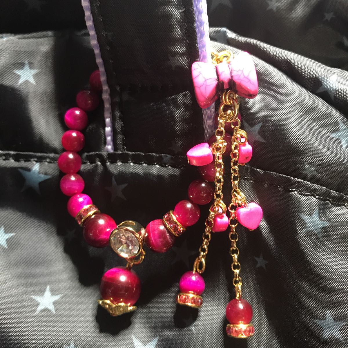 タイガーアイは10ミリ8ミリ6ミリ使用しております。とても可愛い仕上がりになっております。タイガーアイは仕事運金運が上がるといわれる石ですのでぜひバッグに付けてみてください。