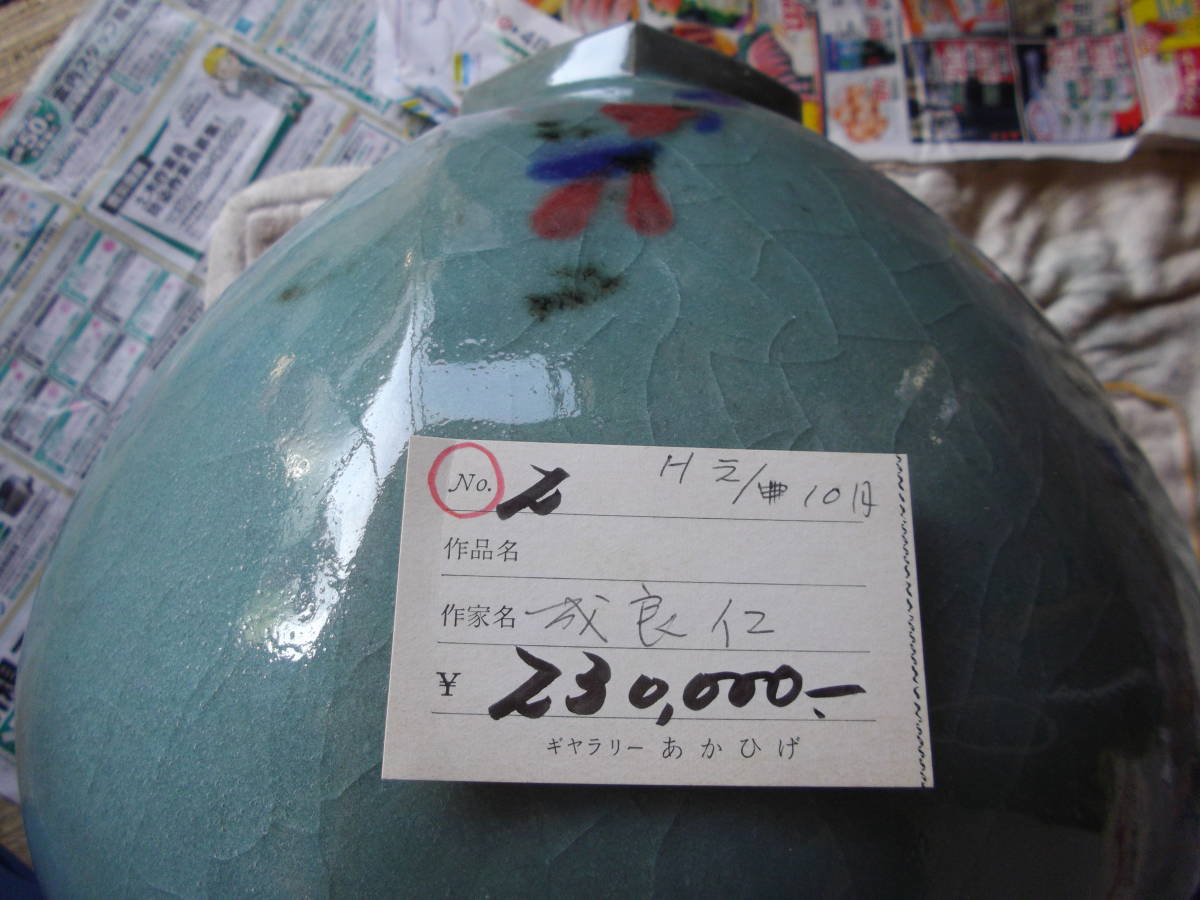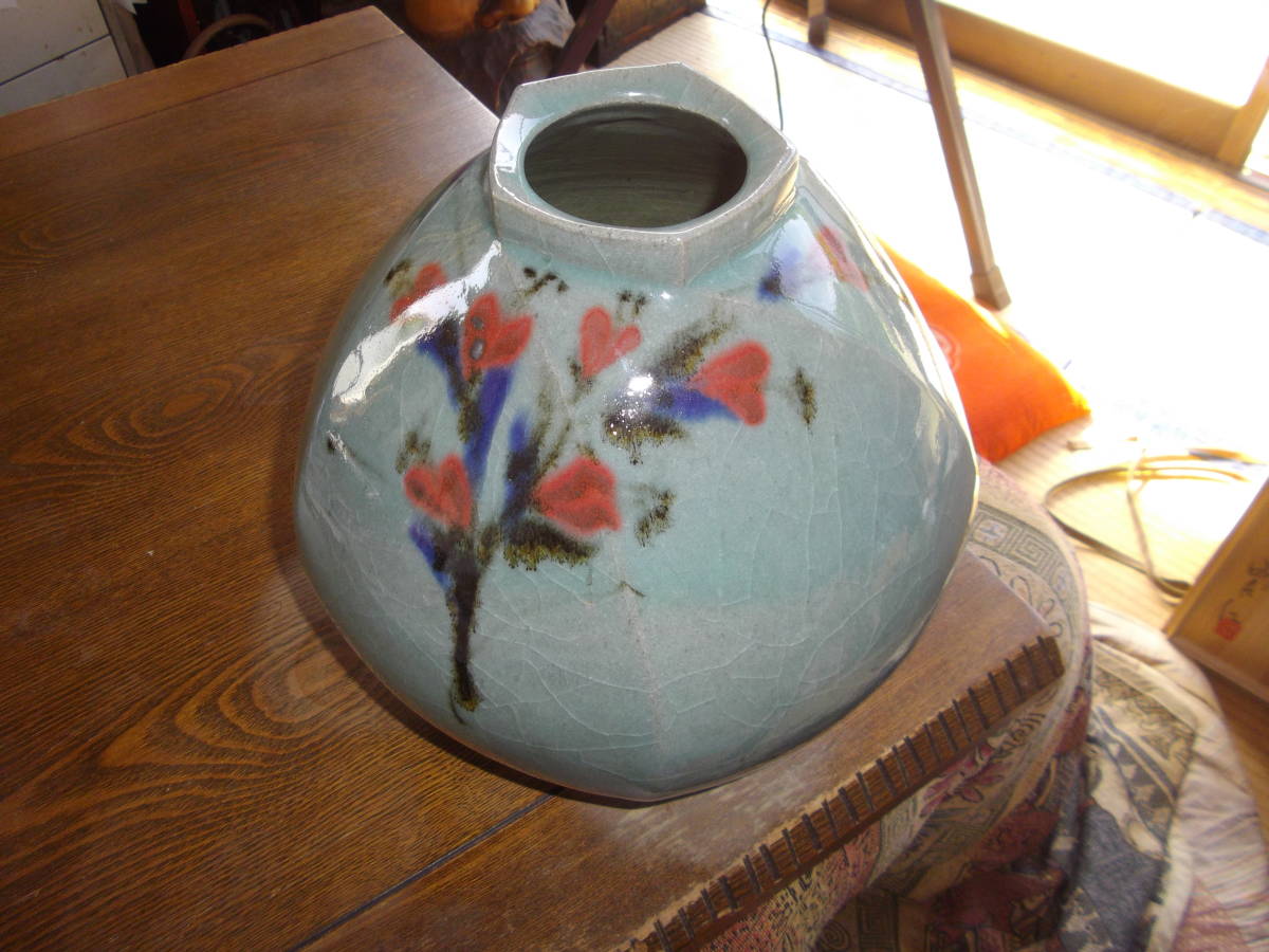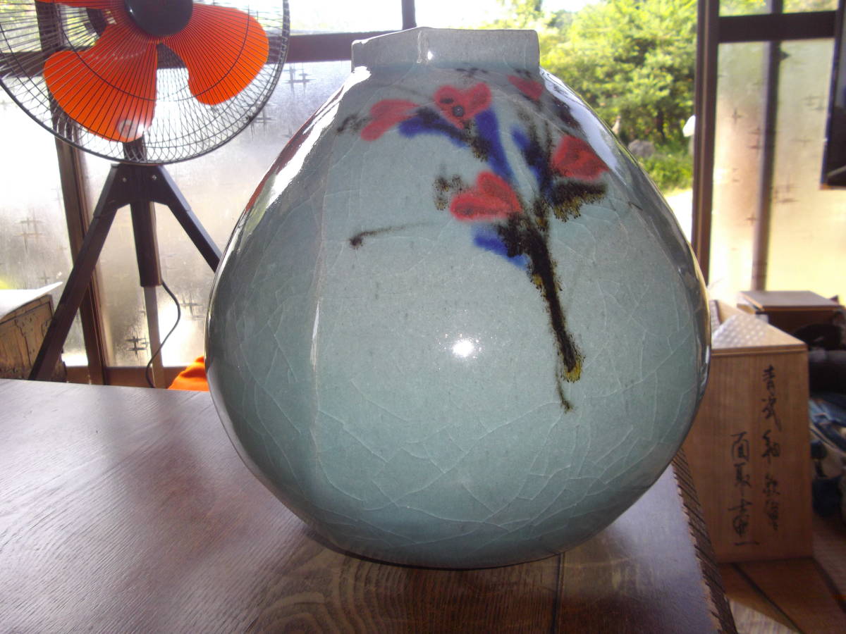 益子焼、成良仁作の最高傑作、青磁釉鉄絵壺。共箱に仁の箱書きあります。珍しい、かき落とし壺で、絵付けも田村耕一に似て、独創的です。なお今回、値下げ致しますので、NC、NRでよろしくお願い致します。