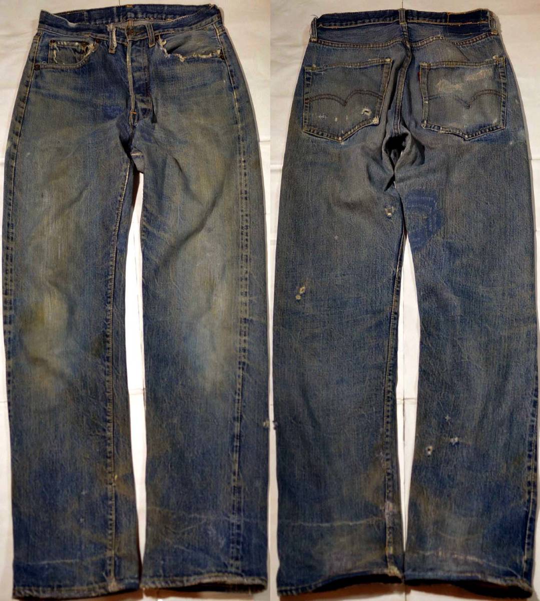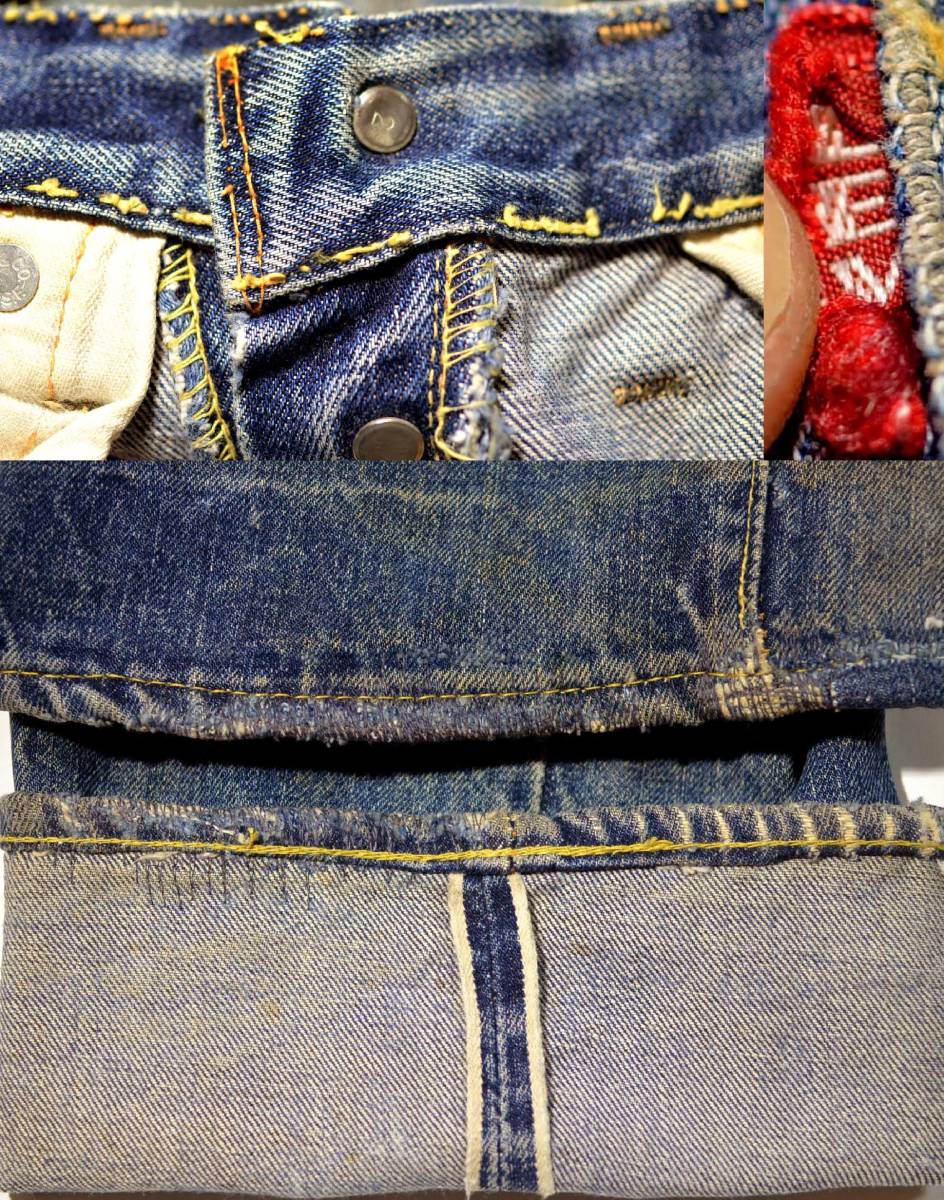 60'sの501ビッグE Sタイプです。復刻、レプリカではありません。『ディテール紹介』フロントトップボタン裏の刻印2、裾オリジナル(リペアにより入替)チェーンステッチ、 フロントポケット、ベルトループ、バックポケット、ボタンフライ、パッチ、ウエスト、インシームなどイエロー綿糸は多数使用されています。 パッチ表記では確認できませんが、ディテールからSタイプと判断できます。『状態』リペア=モモ、股、ベルトループ、左フロントポケット淵、股、裾とその周辺、 他小穴を直したもの数か所。その他=スレ、キズ、引っかけ(小穴等)、ステッチホツレ・補強などUSED感があります。ダメージは大き目に生地補強され、ガンガン穿ける状態です。 『色落ち、特徴など』色落ちは抜群にかっこよく、この年代特有の深みのあるインディゴで、全体に綺麗な縦落ちが走っています。 修理跡も良い味になっており、Sタイプらしい良い雰囲気です。