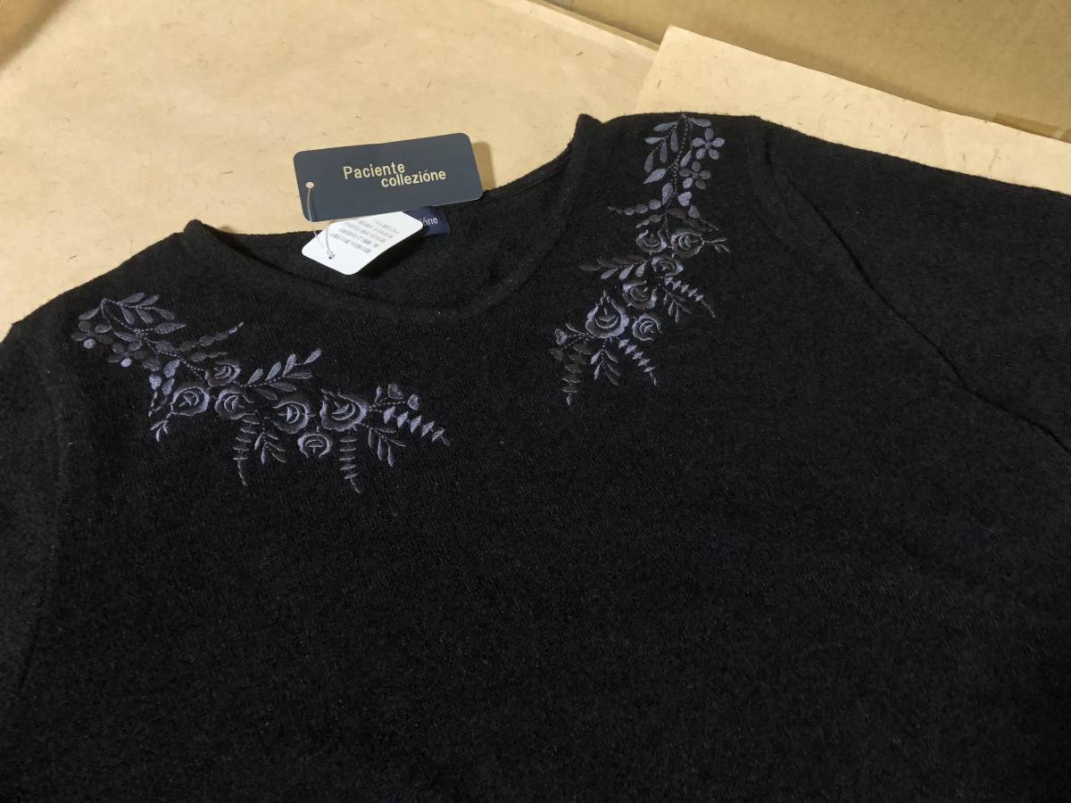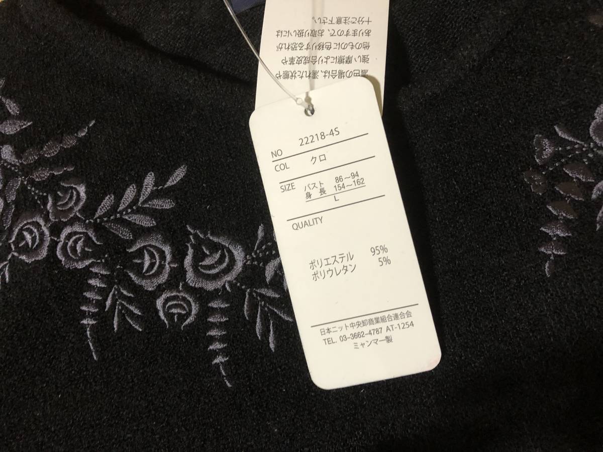 襟刺繍 Vネック カットソー★L★黒
