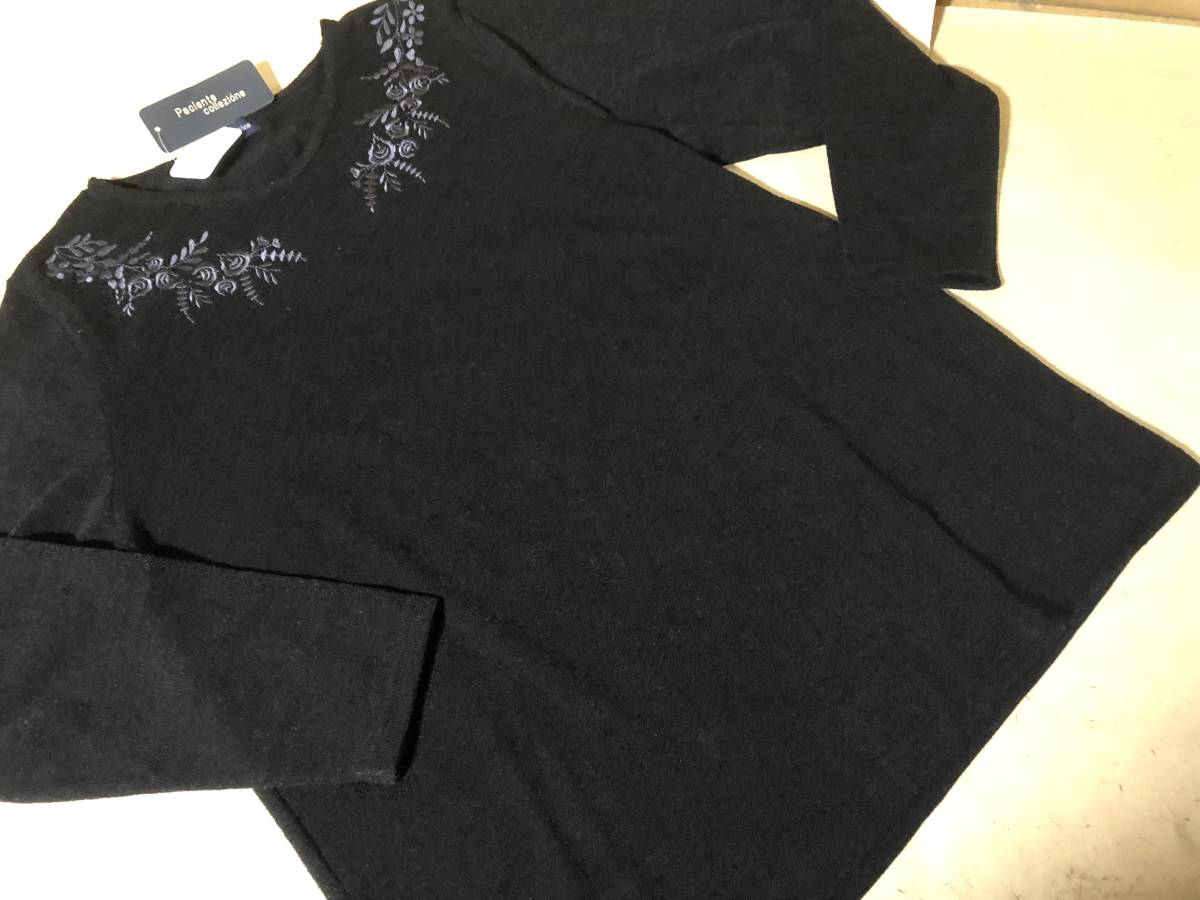 襟刺繍 Vネック カットソー★L★黒