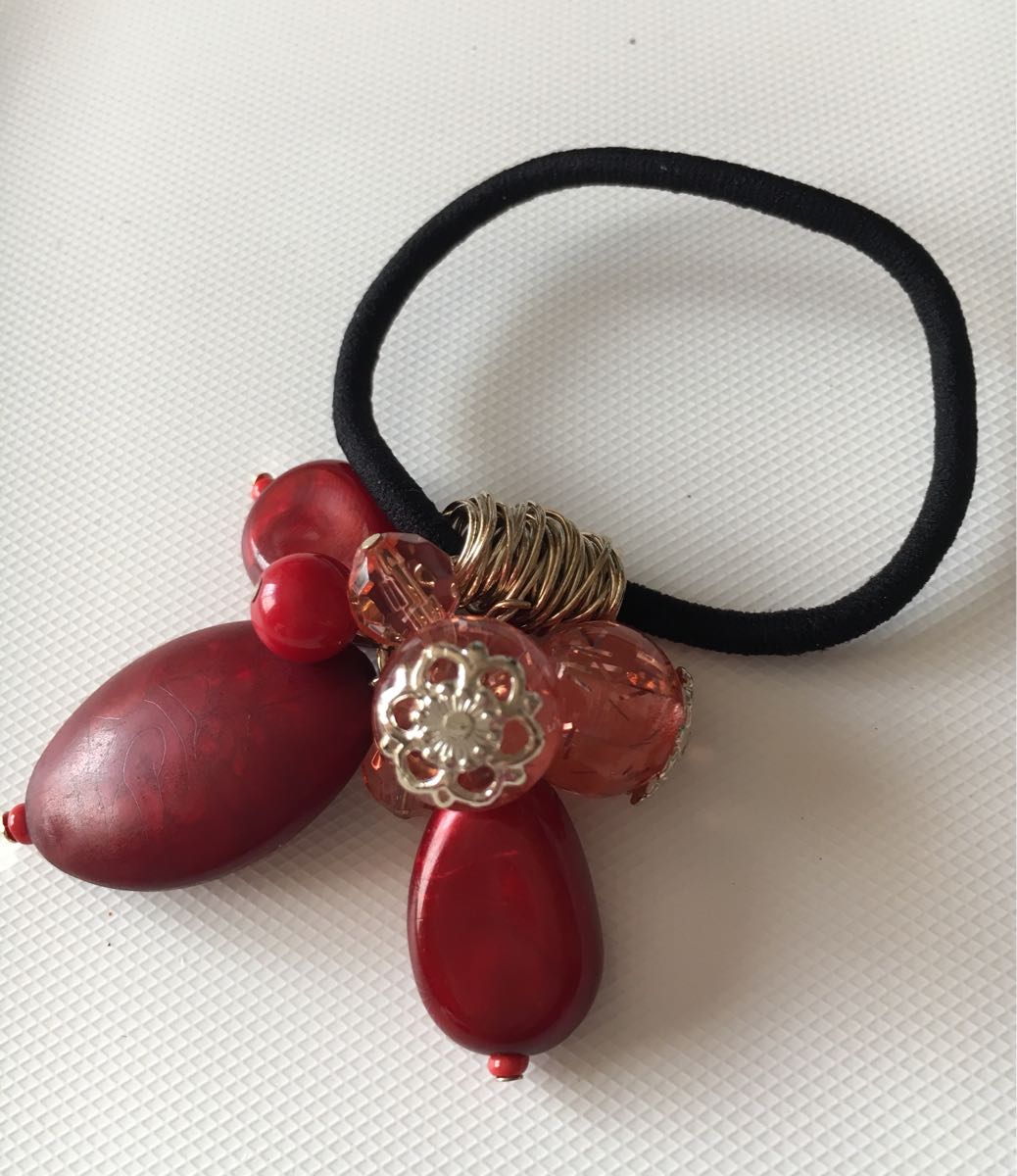 こちらは、赤色の アクセサリーがたくさん付いたヘアゴム になります♪