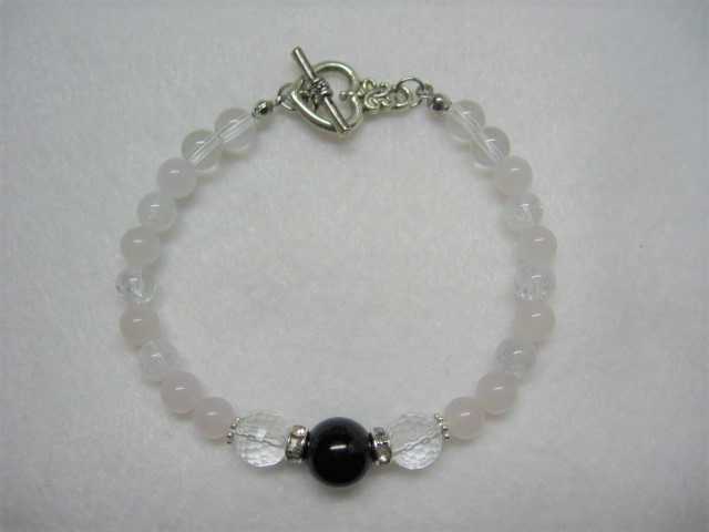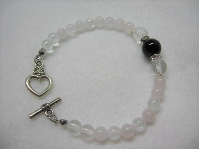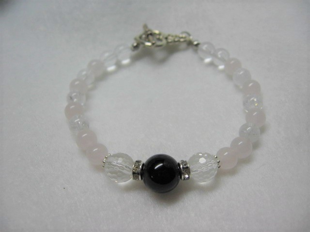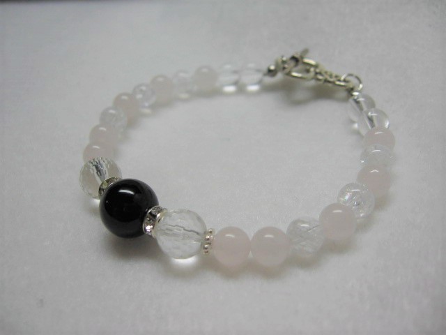 天然黒水晶(モリオン)&天然ローズクォーツ恋愛の石&128面ラウンドカット水晶デザインブレスレット10㎜8㎜6㎜アンティーク調ハート留具