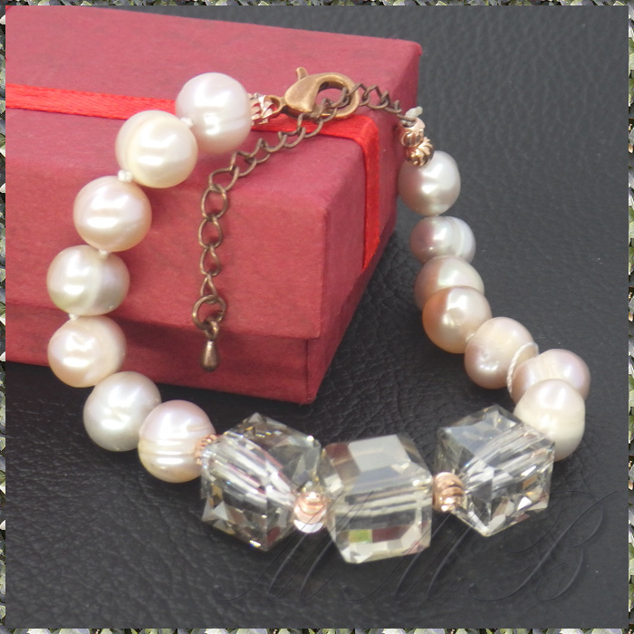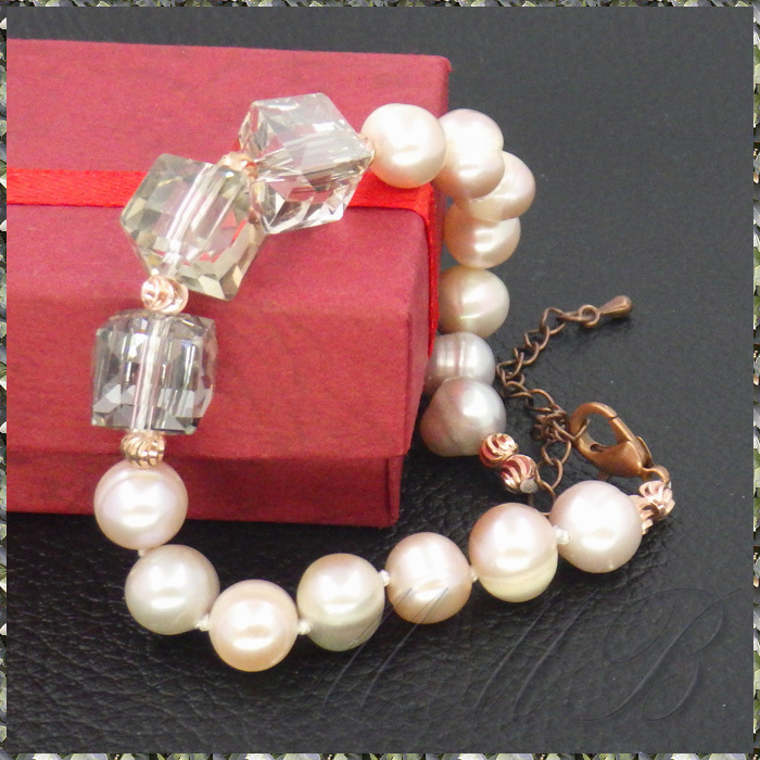 約8.5mm前後のピンクパールと約10mmキューブ型キュービックジルコニアが連なったブレスレットです。
