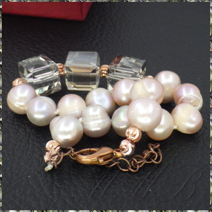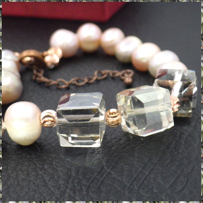 Natural Pink Freshwater Crystal Cube CZ クリスタル キューブCZ ローズゴールドチャーム ピンク淡水パール ブレスレット です。