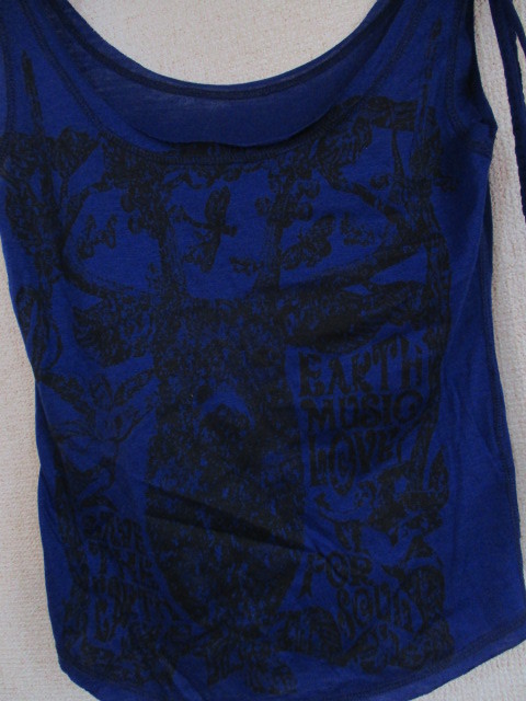 商品紹介 | 黒のプリントが入ったタンクトップです。 左肩に三つ編みを輪にしたものとフリンジの飾りが付いています。 地色は青紫っぽい色合いです。 端は切りっぱなしです。 《素材》 ポリエステル65% レーヨン35% |