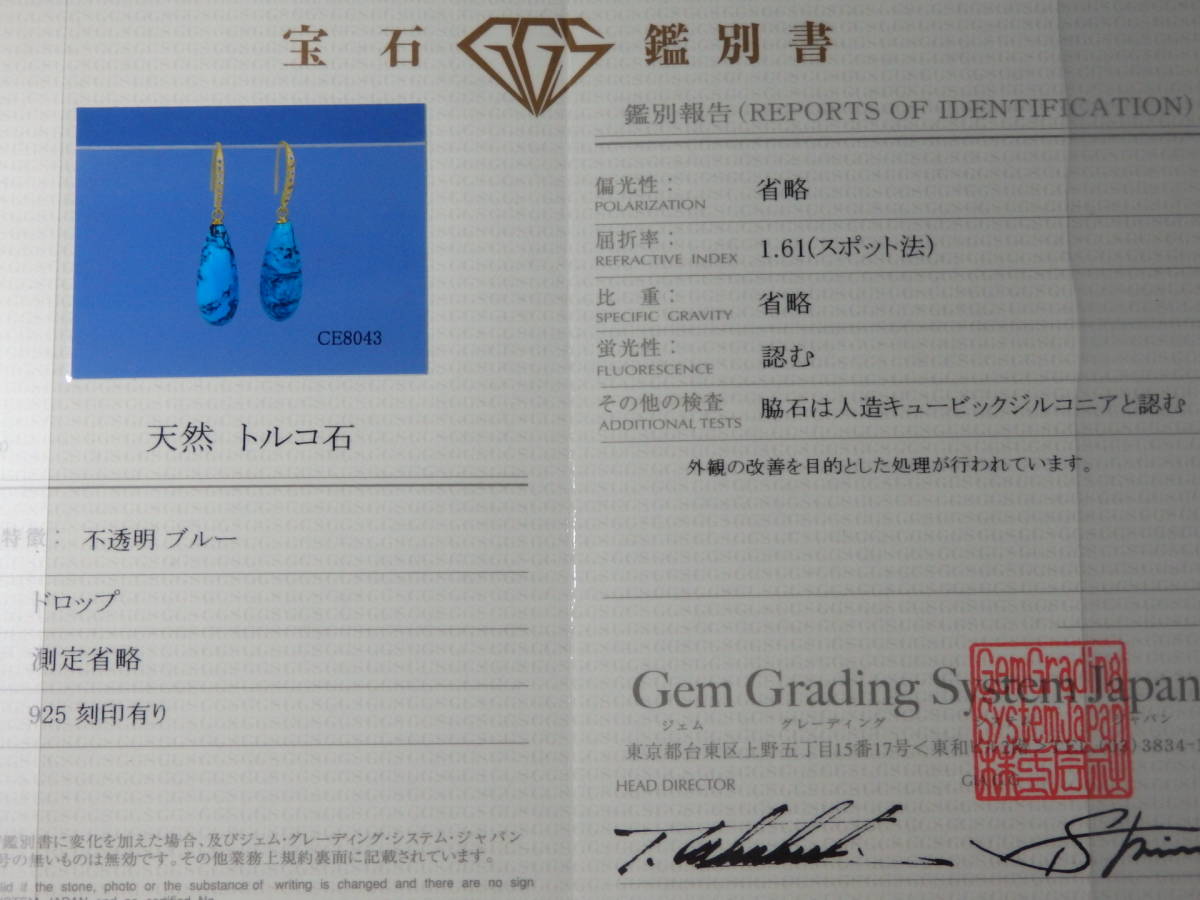 天然トルコ石 自然色  ピアス 鑑別書付
