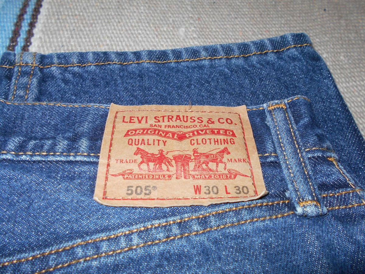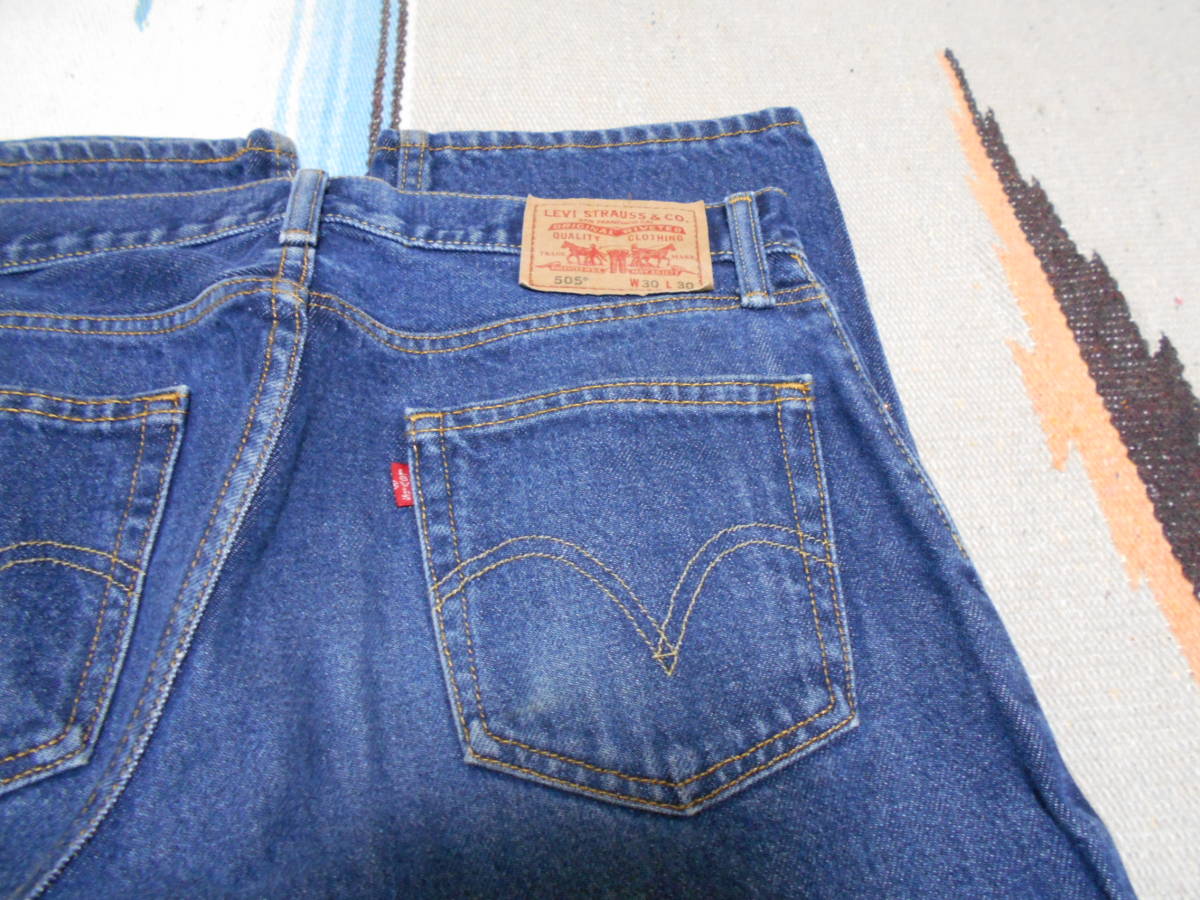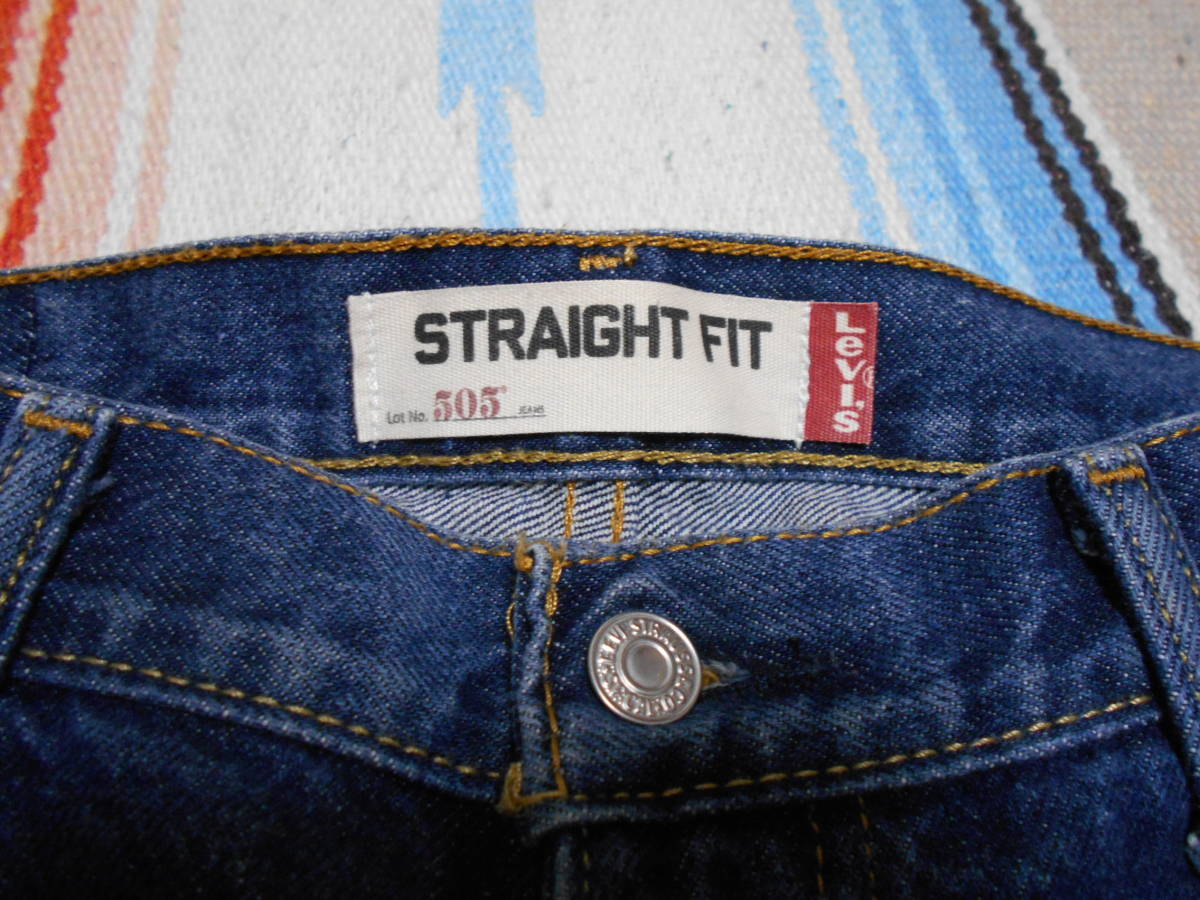 Levi's USA 505 REGULAR FIT 特有、タイト過ぎないストレートレッグスのシルエットライン、バックポケット形状、インディゴ ハイオンスデニム素材感、伝統的なディテール