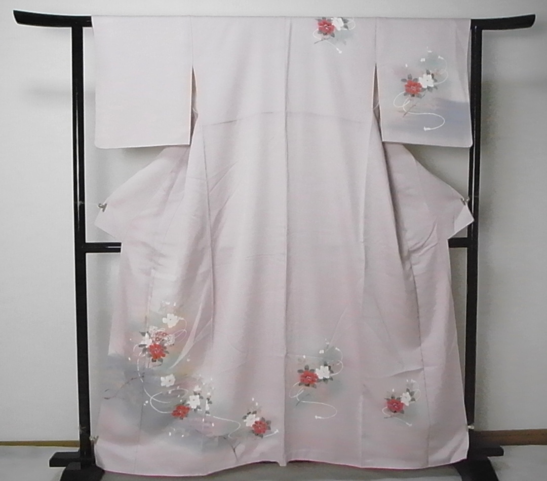 【着物のちさと屋】B579 着物・付下げ 袷 良質 ややLサイズ  正絹なし地ちりめん 薄ピンク地・飾り紐花枝柄模様