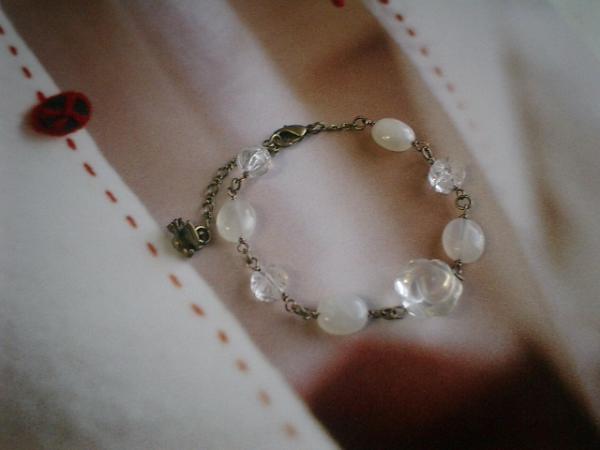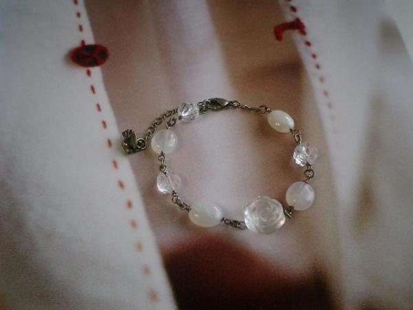 初夏(♪)シリーズ!です♪透明なイメージのシンプルで可憐なブレスレットを作りました♪シックなムーンストーンと水晶を合わせました♪♪ムーンストーンは14×10ミリ位のオーバルで水晶は8ミリの両面薔薇、14ミリの薔薇、8ミリの彫り水晶です♪♪オフホワイトでまとめてさりげなくロマンチックしています♪長さは全長21センチ位で調節自由です♪シンプルでいつまでも着けられるデザインを考えて作りました!♪カジュアルからロマンチックまでお楽しみいただけます♪お揃いのネックレスも出品しています♪ハンドメイドをご理解頂いてノークレーム、ノーリターンでお願いします