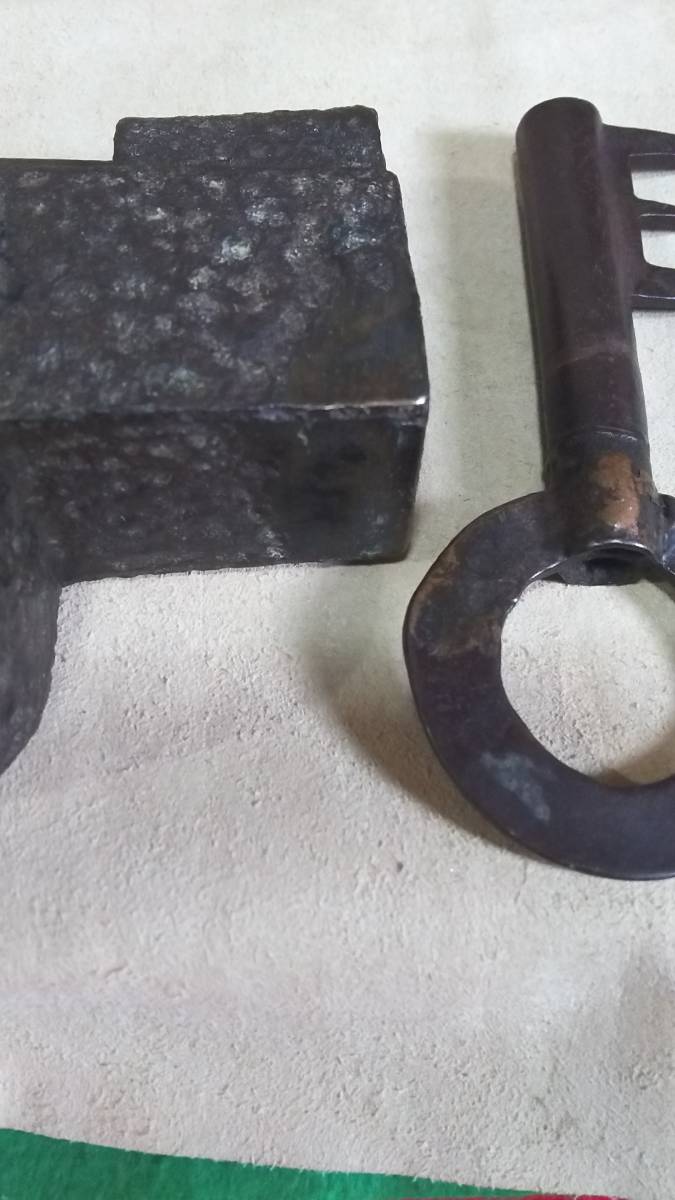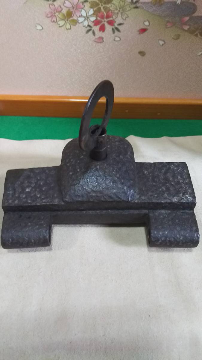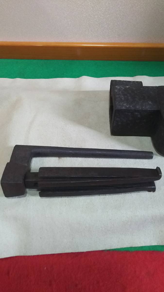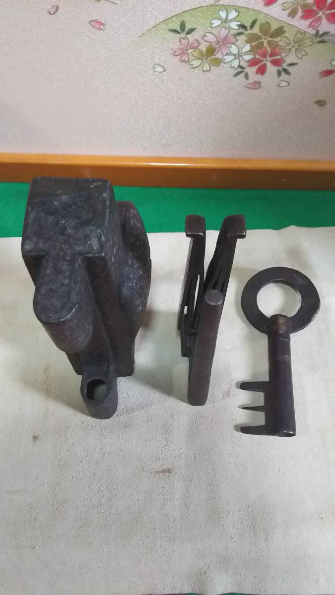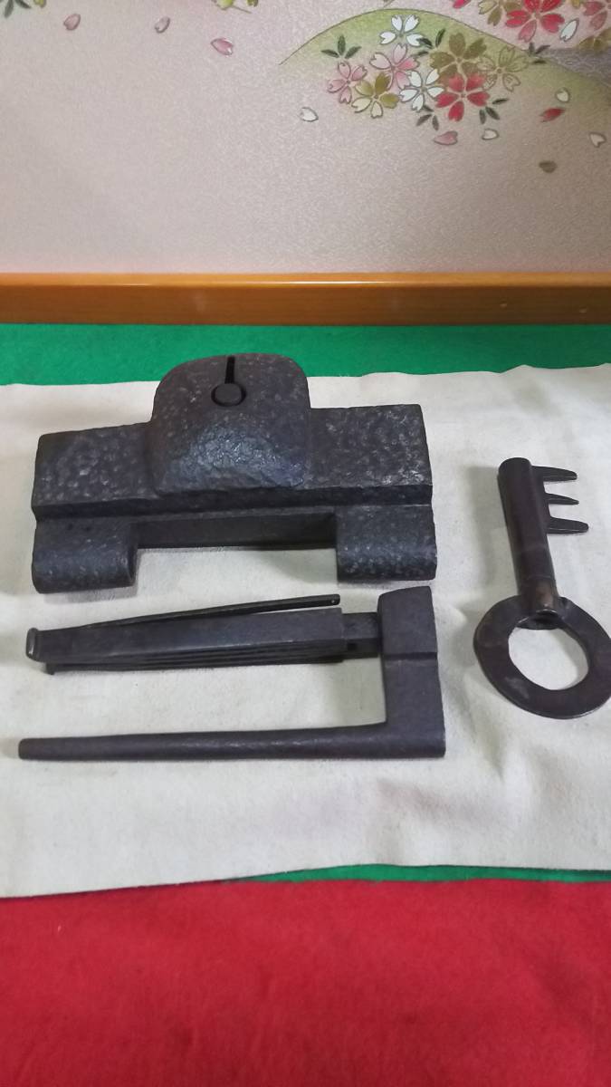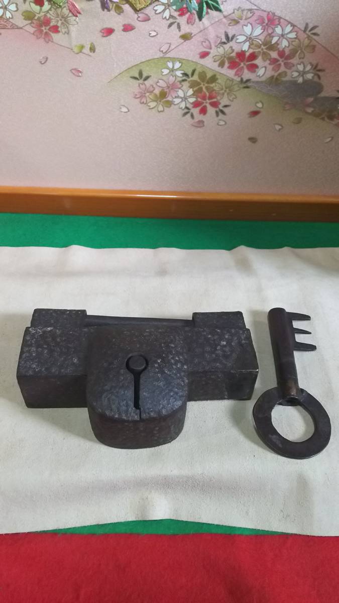 (鳥羽庵)初荷品蔵出し江戸期大型因幡鍵(八枚板バネ式) 商品サイズ 高さ最大10,4センチ 最大厚み5,6センチ横幅最大17,2センチ 重量1,489グラム 商品状態説明とても大きいサイズの江戸期大型因幡鍵です。右角に直し跡在ります。 鍵穴中央部丸ボチがた動き在ります。 元々の遊びか~鍵の開閉問題なくできます。 重量1,4キロUPです。探しても滅多に出ない逸品です。 状態もとても良好品です。いたバネ縦横8枚式です。 是非コレクション品加えてください。 詳しくは、写真参照でお願いします。 骨董品につきノンクレームノンリターンでお願いします。 落札後48時間4日以内で入金できる方のみ 入札お願いします。 発送は、ゆうパック80にて商品発送致します。