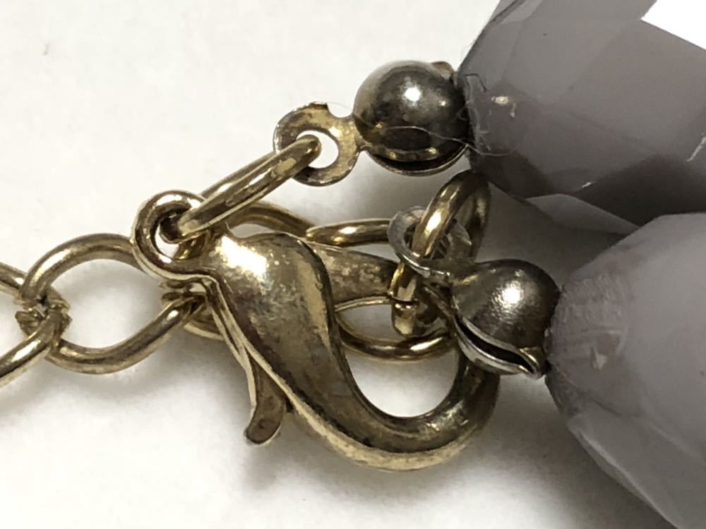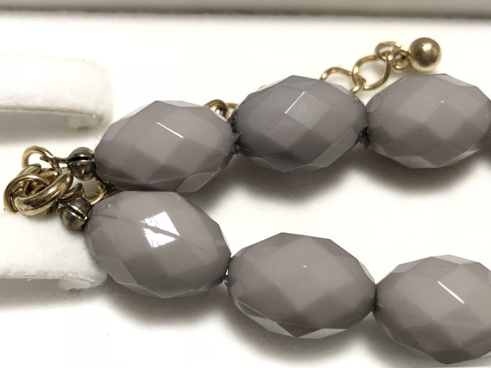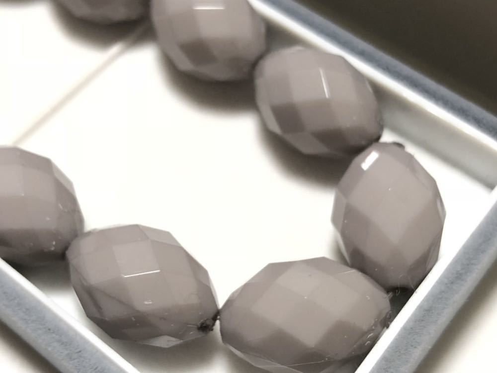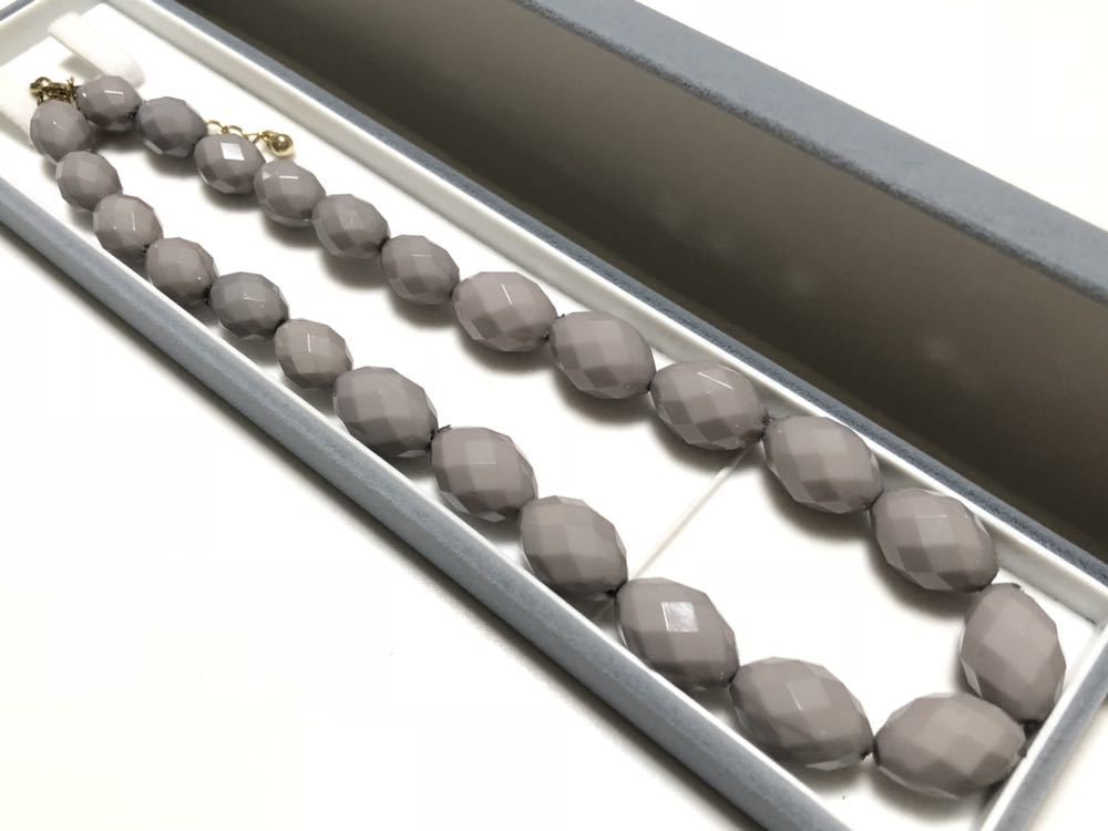 樹脂製のオーバルチェッカーボードカットを施した、グレーカラーのネックレスです。金属面に若干のくすみがあります。長さ調節可能です。
