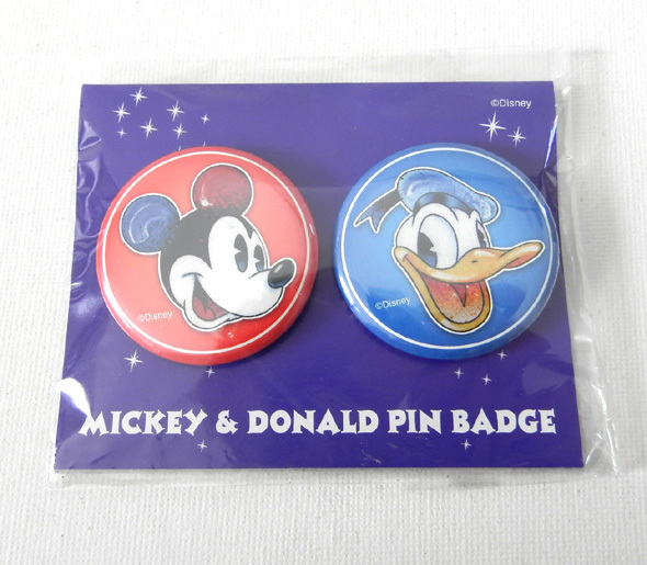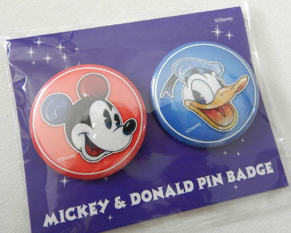 色鉛筆のようなタッチで描かれたミッキーとドナルドのバッジが1個づつ入っています。