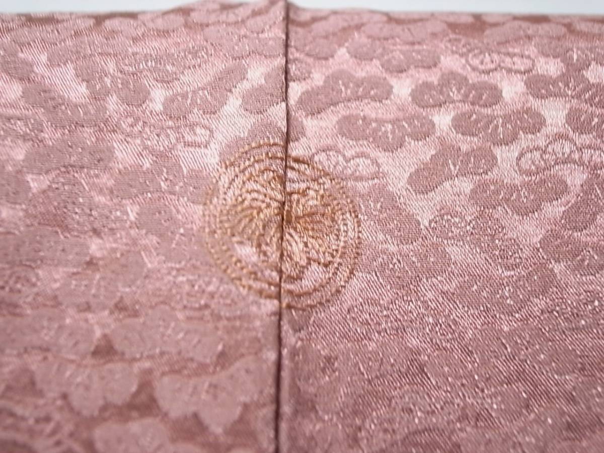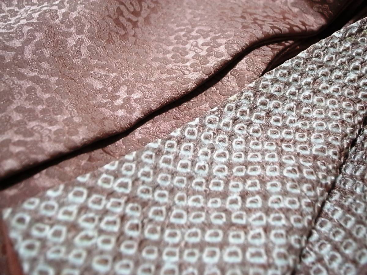【着物のちさと屋】№847 着物・付下げ 袷 正絹紋意匠織ちりめん 茶色地(チョコレート色)・裾絞り平安調柄七宝崩れ 陰紋 金糸入