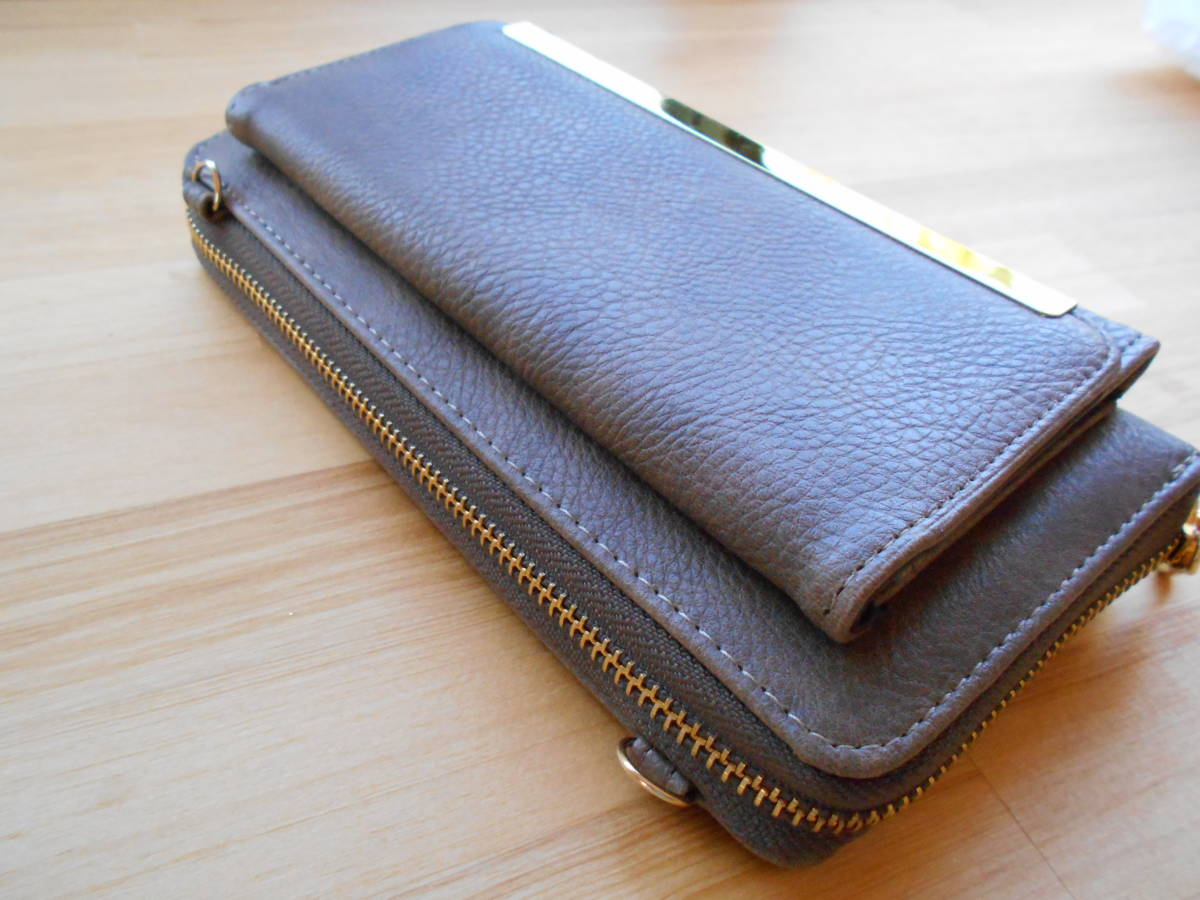 前面かぶせポケットにはスマホが横に入る大きさ、本体は長財布のサイズでお札はもちろん、小銭やカードもたっぷり入ります。