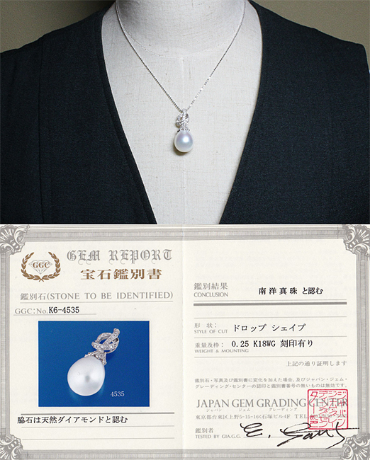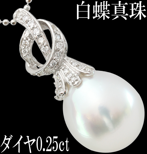 上質☆白蝶真珠 パール セミバロック 14mm 14ミリ ダイヤ 0.25ct K18WG ペンダント ネックレス♪鑑別付・送税込 | ||