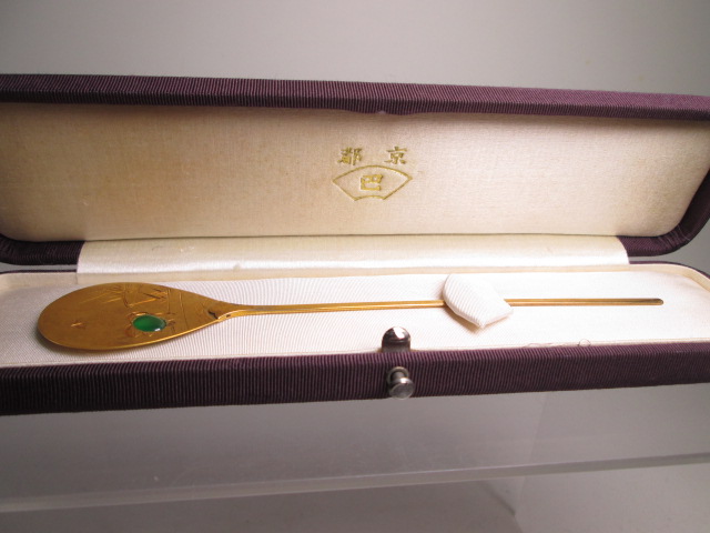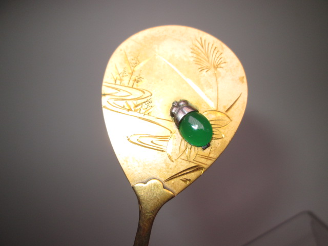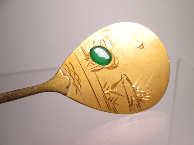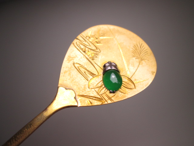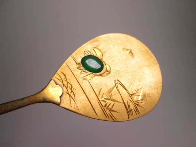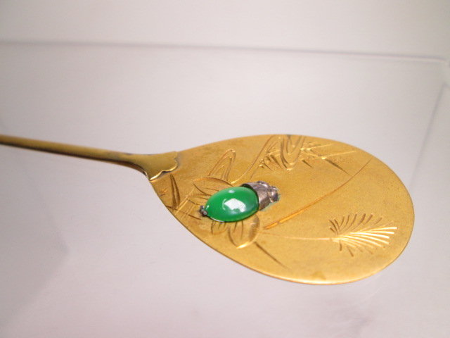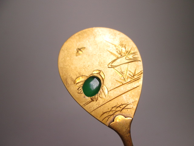 【江月】 アンティーク・巴 金彫金細工 本翡翠飾り 薄に蛍のかんざし 6,93g 共ケース付