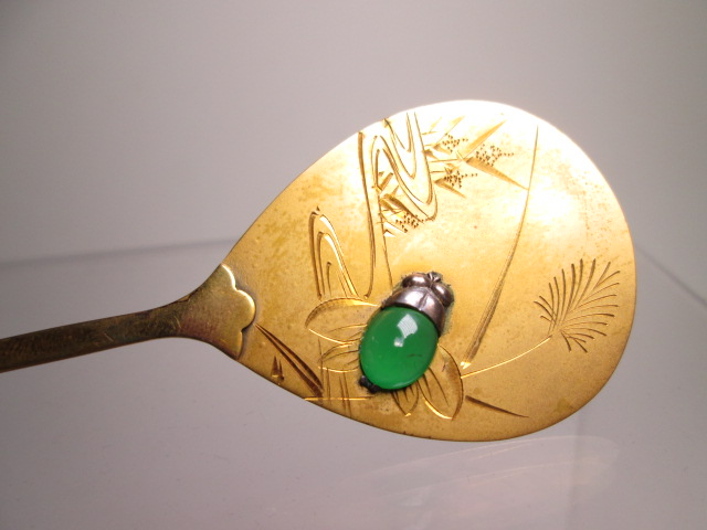 刻印は有りませんが、18金です。銀彫金細工に上質な本翡翠が飾られています。