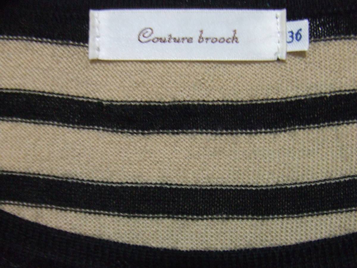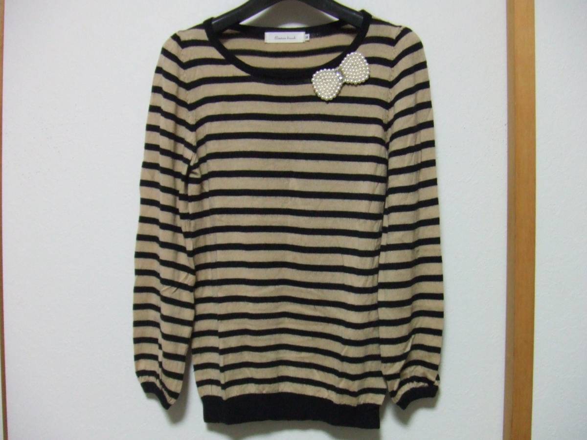 クチュールブローチのボーダーニットです。パールのリボンがポイントになっていてかわいいです。お色はベージュ×ブラック。サイズは36。素材は毛100%。平置きで丈59cm、身幅38cm(多少の誤差はお許しくださいませ。) 発送方法は ●定型外郵便 ●ゆうパック になります。目立たないシミや汚れ、ホツレ等見落としがある場合がございます。あくまでも中古品になりますので、くれぐれも神経質な方、細かい事をお気にされる方のご入札はご遠慮下さい。稀に中古品にご理解のない方がいて困っています。ノークレーム・ノーリターンにてお願い致します。ご質問がある方は遠慮なくどうぞ。