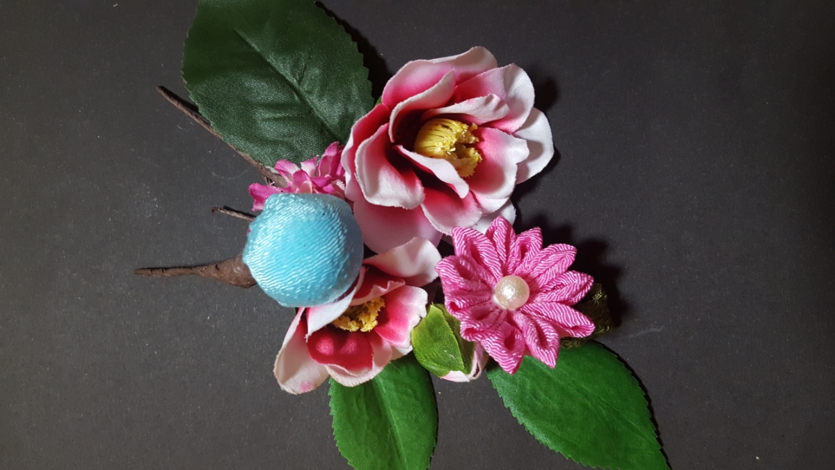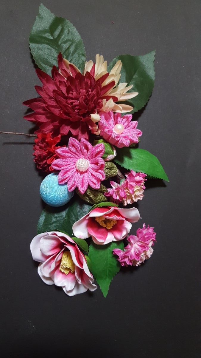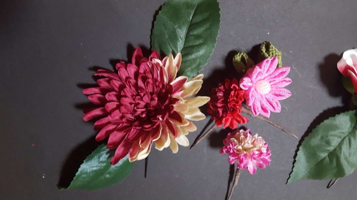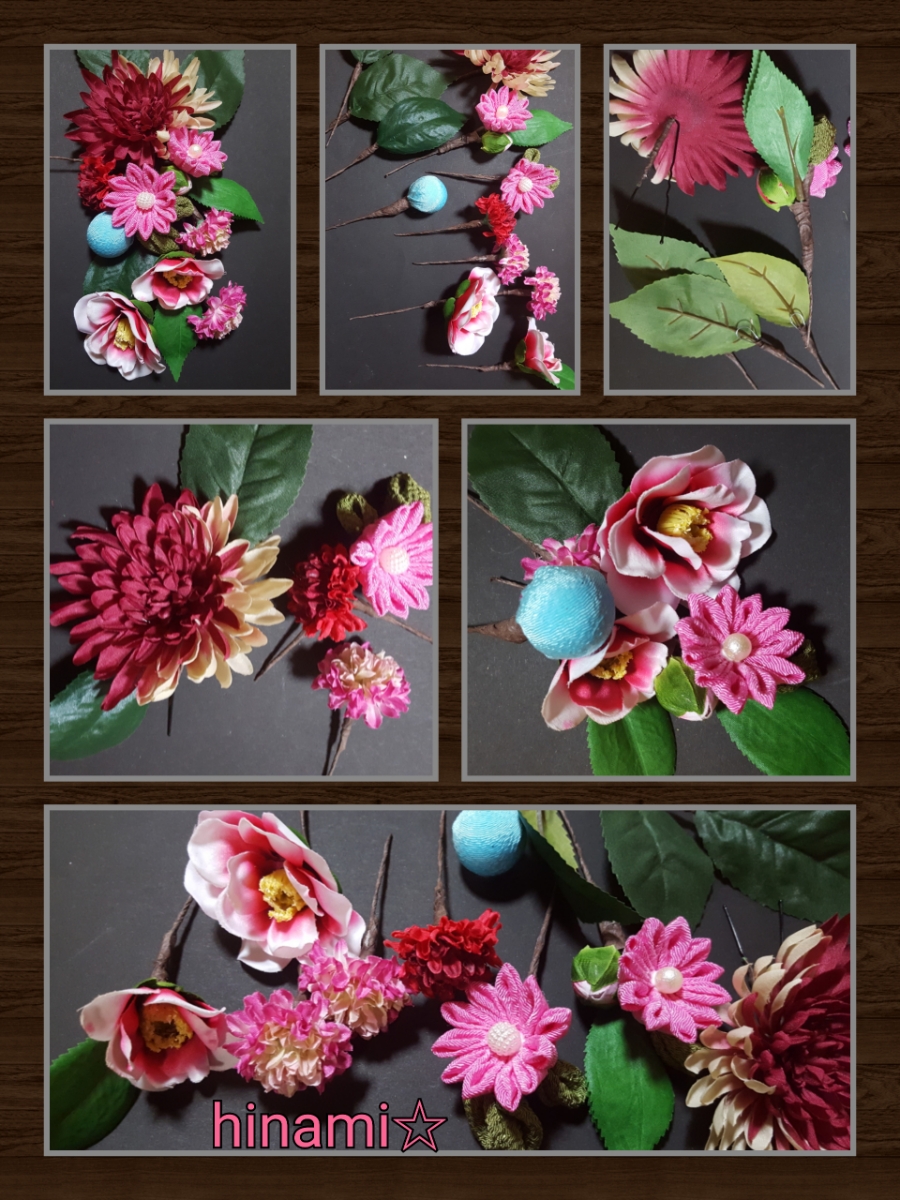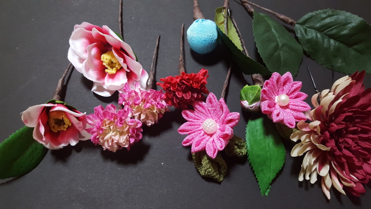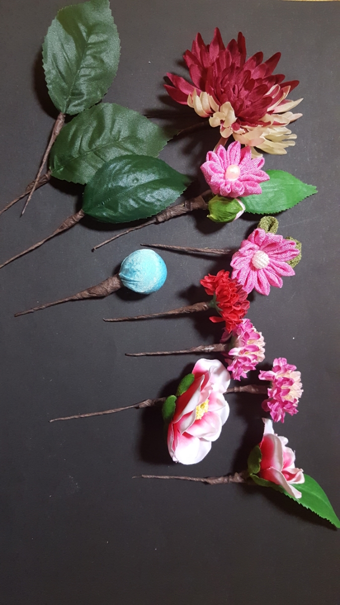 つまみ細工 とアーティフィシャルフラワー(造花)の 花で、ヘアパーツ作りました。一つ一つワイヤー処理とフローラルテープでまいて、かんざし風にしてます。まとめてや、ちらして、組み合わせ自由です。フラワー装飾技能士とデザイナー講師をしています。いくぶん丁寧をこころがけていますが、手作りご理解のうえ、画像参照で、落札後の返品ノークレームでおねがいします。他にも、色々出品させていただいてます。