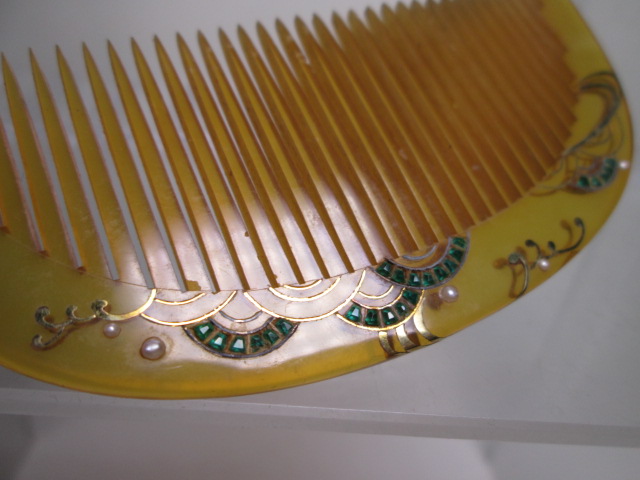 【江月】アンティーク・本鼈甲緑石&真珠飾り波紋の櫛&笄 木箱付