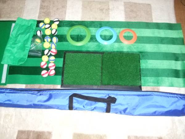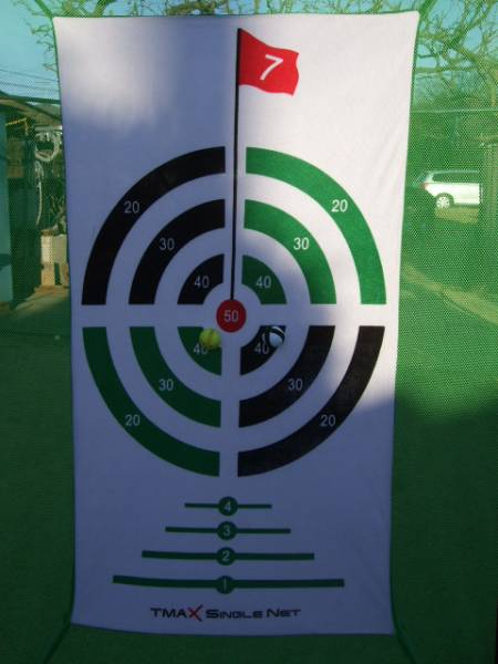 | ■商品説明■ | TMAX SINGLE NET 新品 5点セットです。 遊びながらアプローチが上達請け合い!しかも組み立て簡単!室内&室外どこでも設置可能です。 ゴルフボールにマジックテープが巻かれているのでアプローチする的にペタッと張り付き、的に標示したヤーデージを目安にアプローチの練習が楽しみながら出来ます。 TMAX SINGLE NET 新品 5点セット 24800円(税込み26040円 ① ネット本体 サイズ:約1900mm×約1100mm 奥800mm 的 2枚 サイズ:約1300mm×約760mm 三脚フレーム棒 1本+羽根フレーム2本 専用袋付き ② ショットマット(フェアウェイ用芝&ラフ用芝)サイズ:500mm×250mm ③ ゴルフボール(マジックテープ付き)20個+スポンジボール(マジックテープ付き)1個 専用袋付き ④パターマット サイズ:約3000×約480 厚み5mm ⑤パター用ゴムカップ 3枚 設置説明書あります。 | ||||||