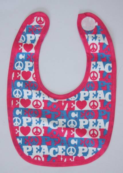 大人気のラブ&ピース柄のとっても可愛いよだれかけです。