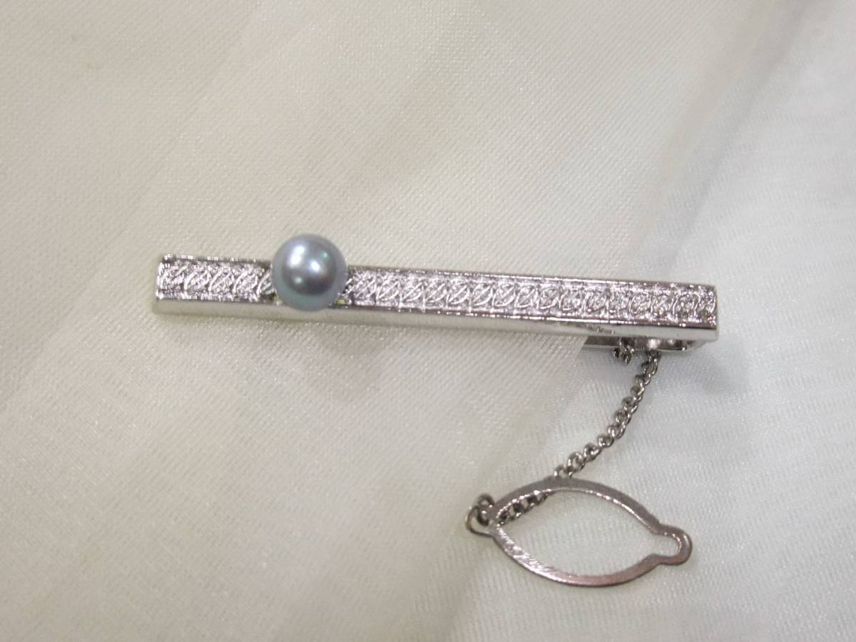 綺麗♪日本産アコヤ真珠本真珠使用のビンテージデザイン系♪silverGシルバー鍍金かニッケルシルバー品レトロアンティークな雰囲気のタイピンタイバーネクタイピン☆シンプルでフォルムが美しく♪☆ややレトロな正統派のクラシックタイプ♪紳士系は勿論、粋でちょい悪オヤジ系や英国スタイルやビンテージアンティーク系小物がお好きな女性にも☆数回のusedですがこのシリーズはかなりに古いので経年感や小錆保管時の小キズなどあるものも、なので画像をよく吟味してください☆