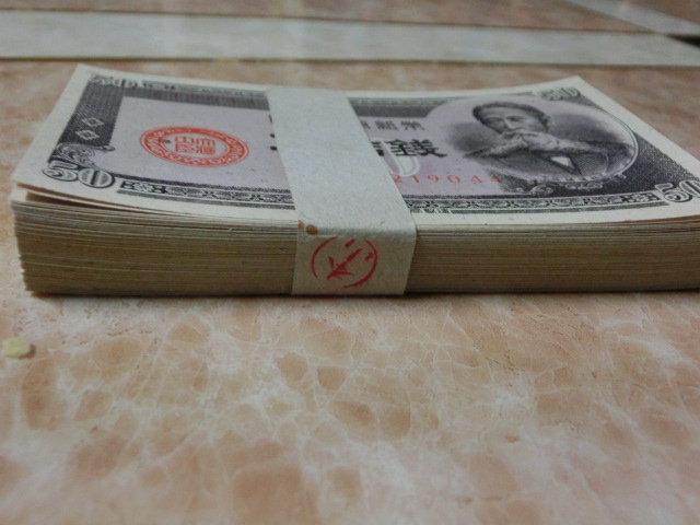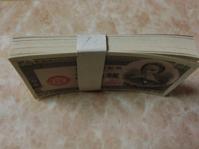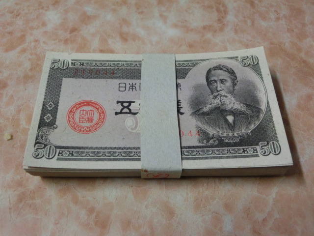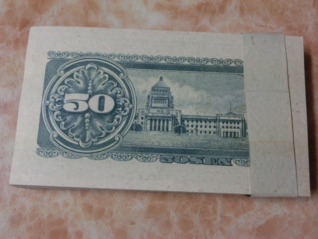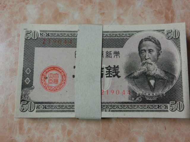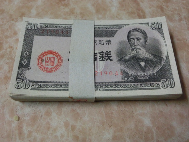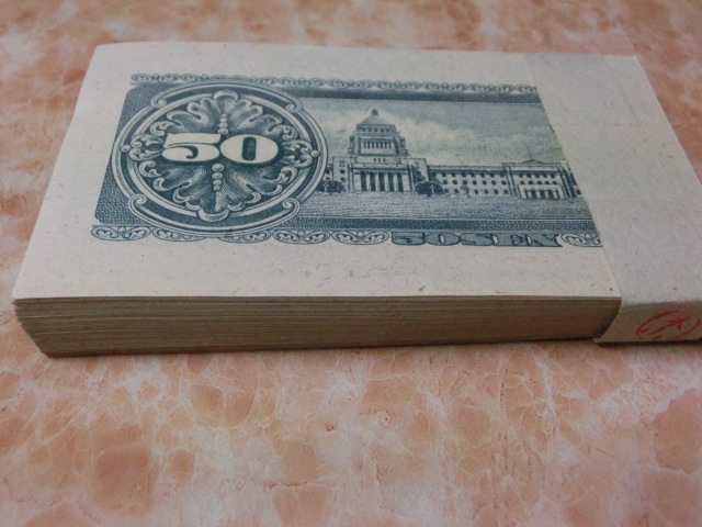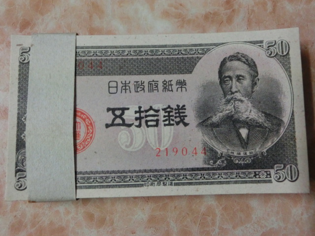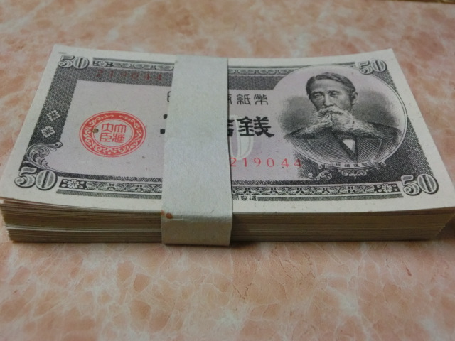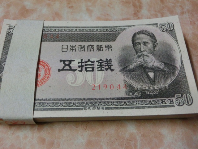政府紙幣B号50銭 板垣50銭 榎町工場の未使用・同番を100枚です。