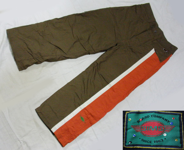90年代SIMSのスノーボード用のパンツです。素材はシェル、ライニング共にナイロン100%、色はこげ茶×白×オレンジになります。お探しの方、この機会に如何でしょうか?中国製です。