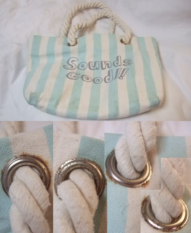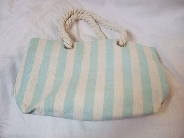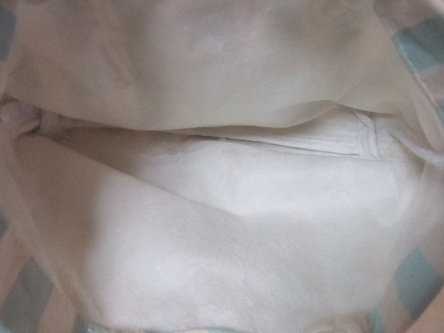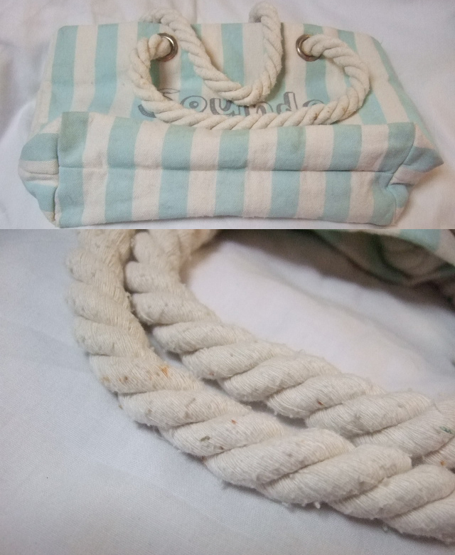 ジャンク品(手提げ袋(白&水色,ストラプ柄,34 x 21 x 8cm))
