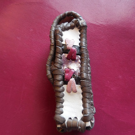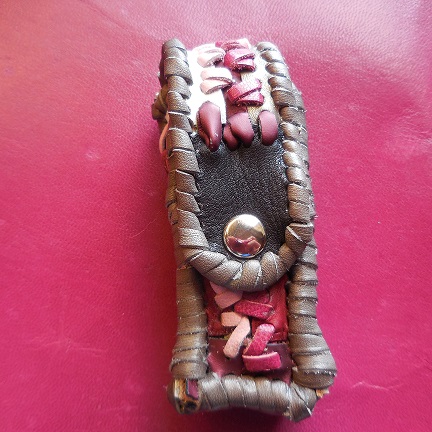 ケース表面(正面、蓋から後ろ、底、両側面)は、カットしたレザーをピンク、ワインレッドのレザーを使い、かがりでつなげたパッチワーク調です。