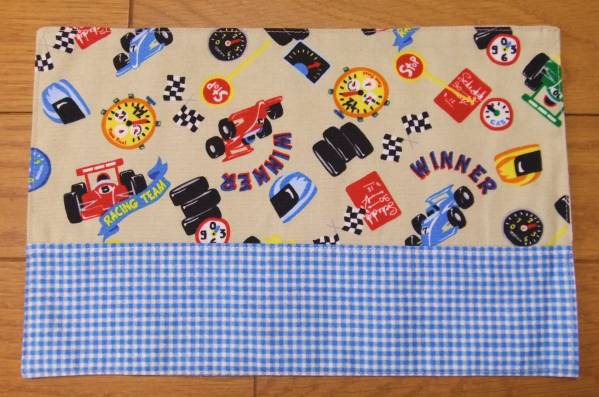 レーシングカーやヘルメット・チェッカーフラッグなどのプリント生地で、ランチョンマットを作りました。地の色はベージュです。