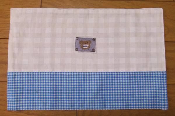 反対面はベージュとアイボリーのチェック生地に青色のチェック生地を組み合わせ、クマのタグを縫い付けています。