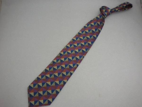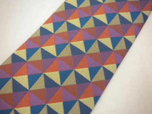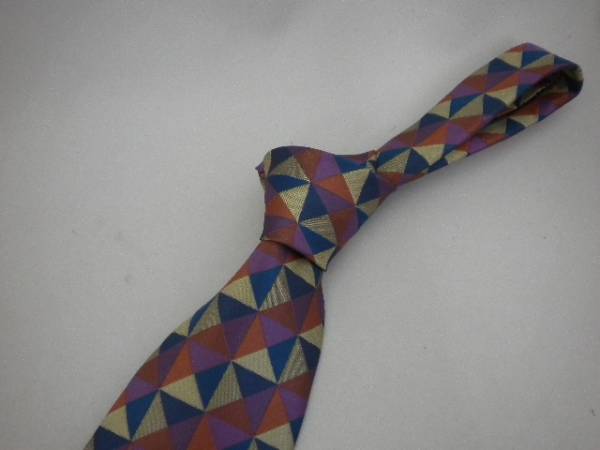 ★ブルーXパープルXオレンジXベージュの幾何学模様ネクタイです。★全長140cm、幅は一番太いところで8.5cm、一番細いところで4cmです。★素材はポリエステル100%です。★男女兼用です。★最近派手めのネクタイが人気です。★カジュアルにも、ビジネスにもご使用になれます。★安心の日本製★男女兼用★新品ですが展示品でしたので、多少の汚れはご了承ください。