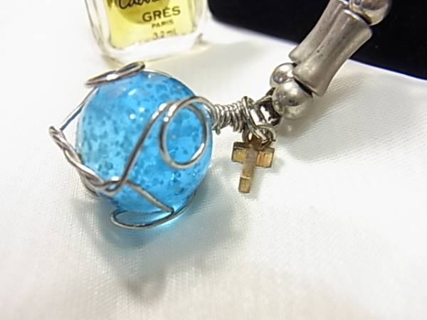 スカイブルーのストーンに小さなクロス十字架チャーム付き