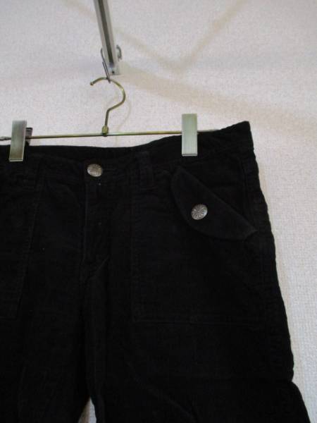 商品紹介 | 黒のコーデュロイパンツです。 ウエストとポケットに付いた花の模様が入ったボタンがポイントになっています。 やや細身のスッキリとした形です。 《素材》 綿100% |