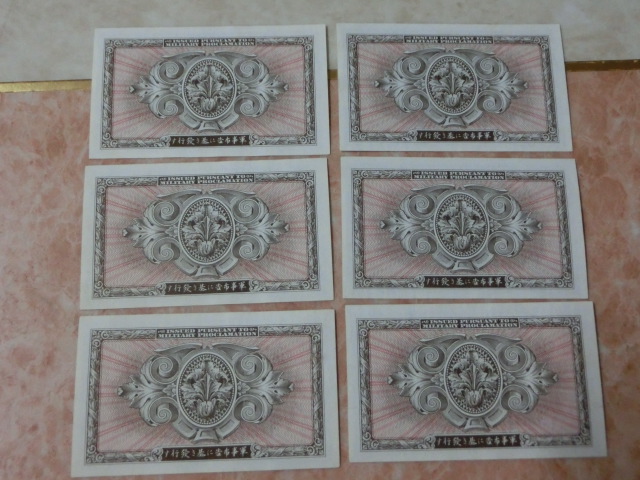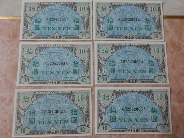 在日米軍軍票 B10円券の未使用~準未使用・連番を6枚です。