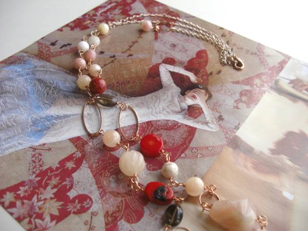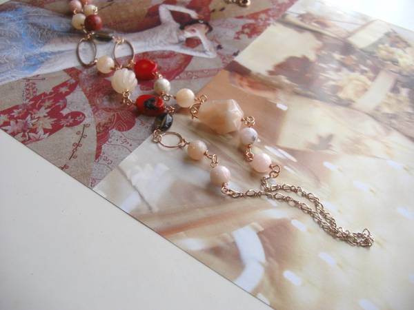 ルーズ・シルエット・・シリーズです♪幸せな時間・・シックなピンクオパールのネックレスです♪8ミリから18ミリ位までの丸玉やラフカットやコイン、オーバルなどデザイン違いのピンクオパール、赤珊瑚やスモーキークォーツやピーチクォーツやデザインリングにピンクゴールドのチェーンを合わせて大人のロマンチックしています♪長さは全長100センチ位で調節自由です♪2連にされても素敵 です♪お揃いのブレスレットも出品しています♪シンプルで飽きのこないいつまでも着けられるデザインを考えて作りました!ハンドメイドをご理解頂いてノー クレーム、ノーリターンでお願いします