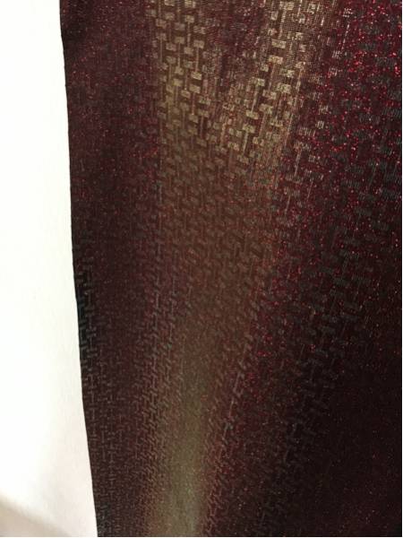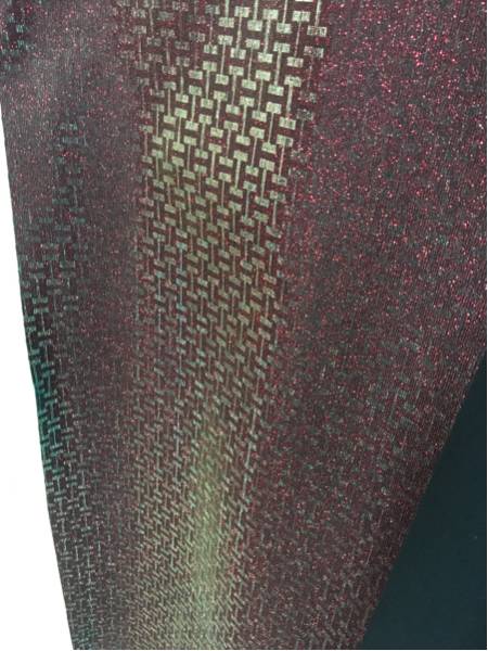 イギリス製高級グリッター生地、幅140cm×1m、T字柄プリント、お色は赤ベースのホログラムカラーで、光の当たり具合で色が変わる大変珍しい生地です。
