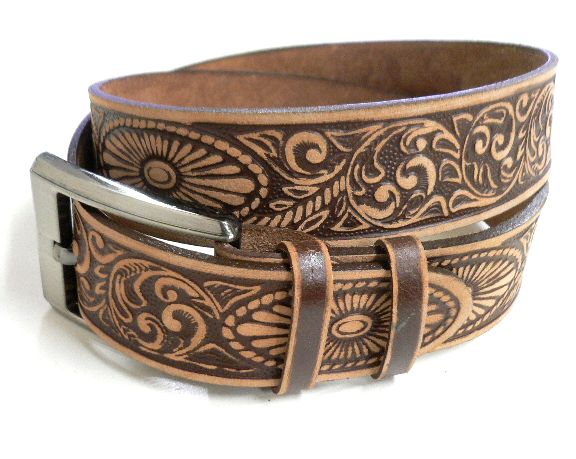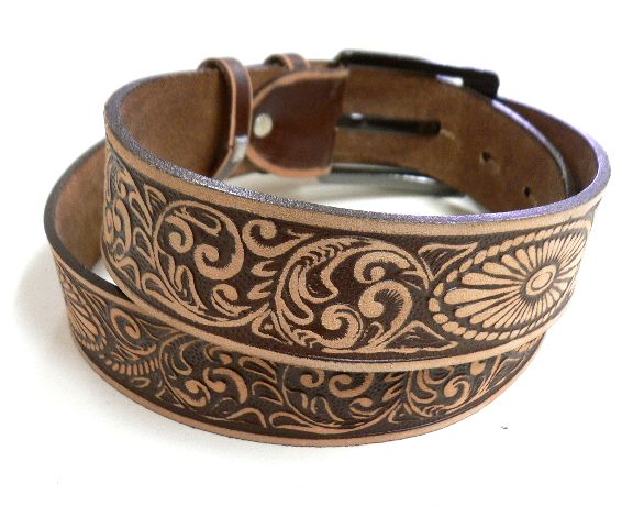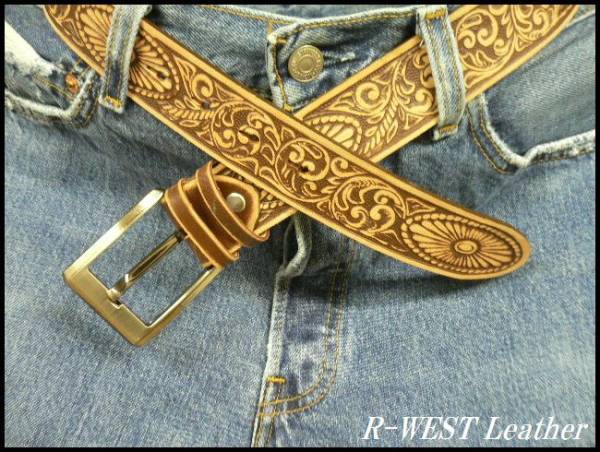 牛革アラベスク型押しレザーベルト こげ茶/100種以上がALL20%OFF