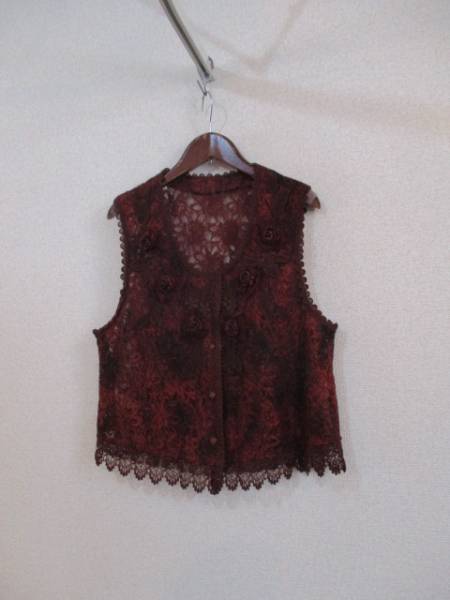 商品紹介 | 総レースのベストです。 胸の花モチーフの飾りがポイントになっています。 色はボルドーです。 《素材》 品質表示がなく、不明 |