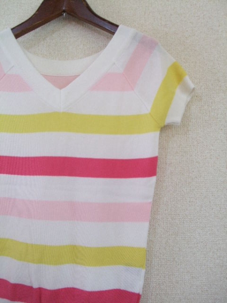 | 商品紹介 | 白地に少し太めの黄色、薄いピンク、濃いピンクのラインが入った ボーダーニットです。 ラグランスリーブにVネックでスッキリカジュアルな印象の形です。 《素材》 綿50% アクリル50% |
