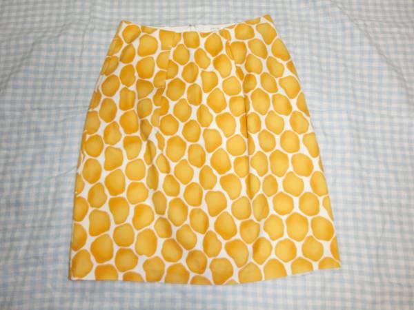 色は白地に山吹色の柄 脇のポケット下あたりにわずかに汚れあり。画像をご覧ください。素材:綿97%ポリウレタン3%裏地はキュプラ100% サイズ34 ウエスト64cm着丈51cmヒップ98cm 他にも洋服、バッグ、靴、小物、本を出品していますので見てください。