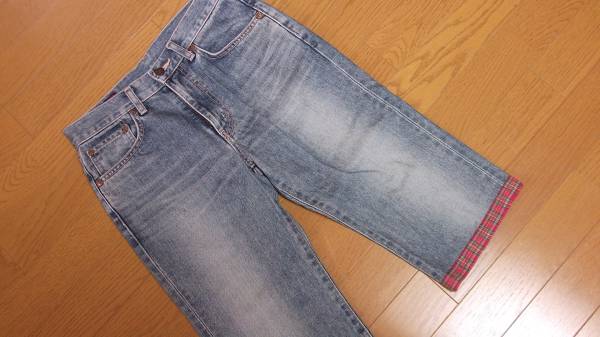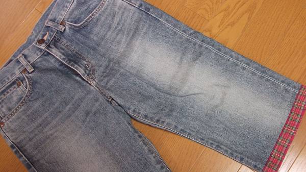 着用感がありますが、しみや生地に傷みのないごく普通のデニムです。綿100%ストレッチなし、裾部分のみ2,5センチ幅の赤系チェック生地を使っているのが、可愛いです。