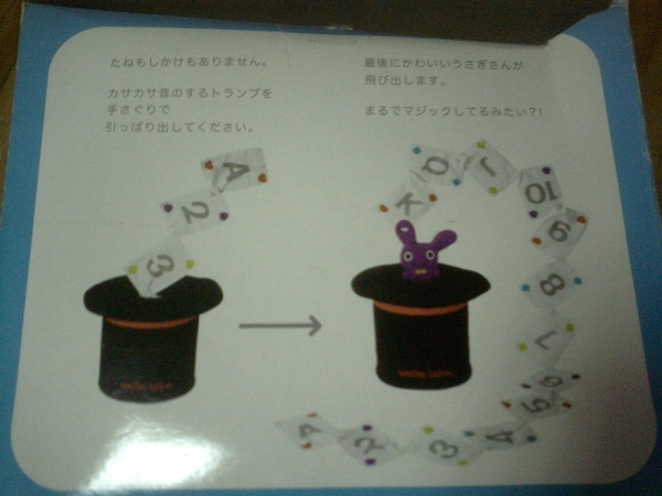 *カサカサ音のする布製トランプをマジックハットからさぐり、引き出し遊びをしましょう。最後にかわいいうさぎさんが飛び出します。まるで手品をしているような気分です。