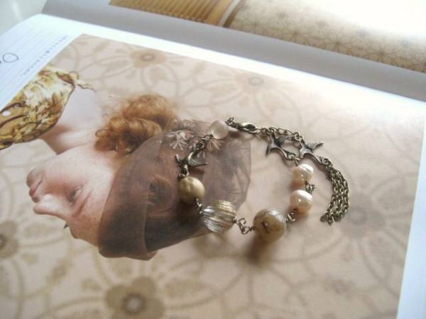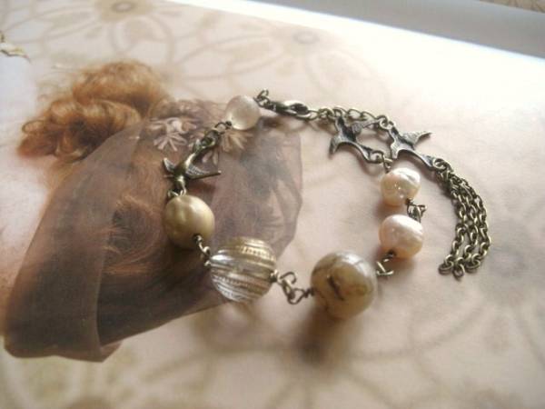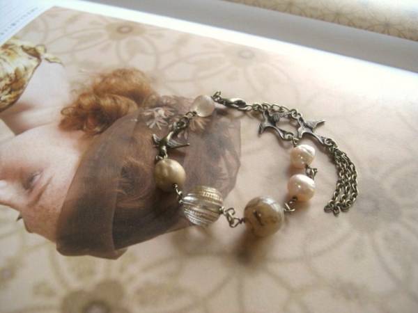 私らしさを+して・・シリーズです♪巴里の小鳥さん・・個性的なバロックの淡水パールと小鳥さんのブレスレットです♪シックなベージュピンクでまとめてアン ティークな表情です♪♪8ミリ位の淡水パールにビンテージビーズや樹脂ビーズ、小鳥さんのメタルチャームを合わせました♪長さは全長22センチ位で調節自 由です♪お揃いのネックレスも出品しています♪ハンドメイドを ご理解頂いてノークレーム、ノーリターンでお願いします