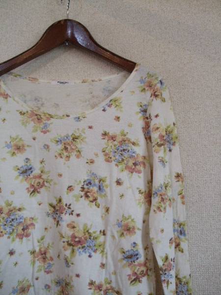 | 商品紹介 | 花柄プリントの長袖カットソーです。 シンプルな形で、色々着回しができます。 地色は白、プリント部分はベージュピンク、水色、青、茶、ベージュ、黄緑等です。 《素材》 綿100% |